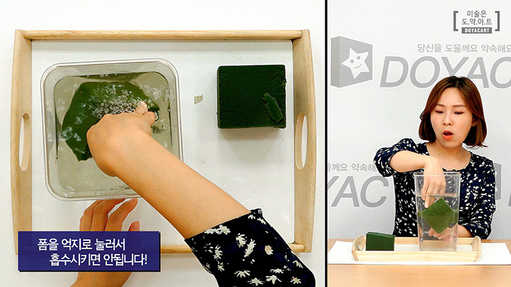 꽃을 처음 배우시는 분들이 가장 많이 하는 실수 중에 하나가 바로 빨리 흡수시키기 위해, 억지로 폼을 손으로 눌러서 흡수시키는 것인데요. 이렇게 하면 겉으로 보기엔 물이 모두 흡수된 것처럼 보이지만 절~대 아닙니다!!