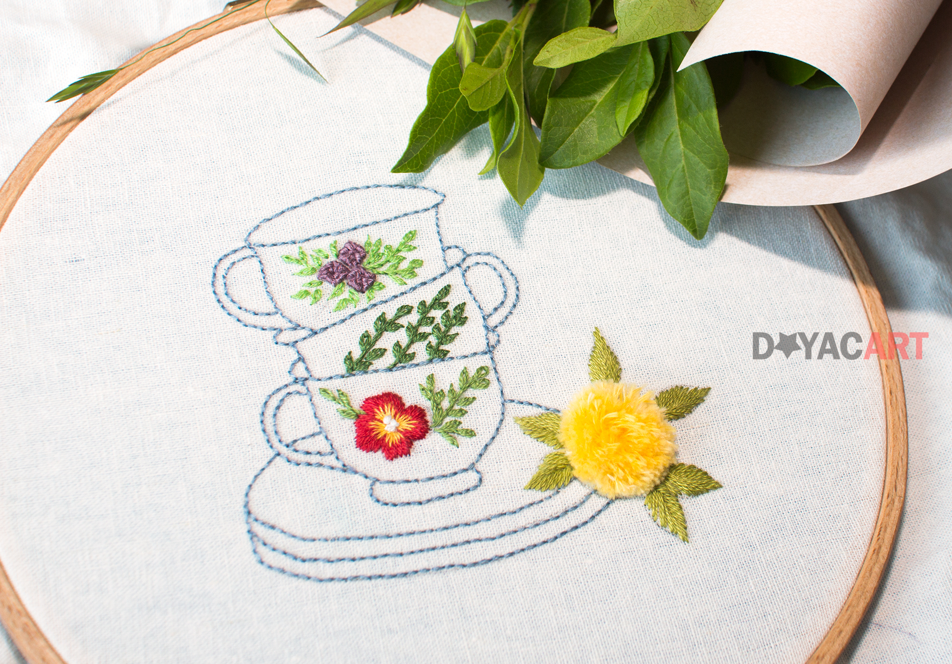◎ 꽃보다 자수 심화편에서 수놓았던 찻잔 자수입니다. 오른쪽 아래의 노란 꽃에 사용된 기법이 대표적인 입체자수 기법인 스미르나 스티치입니다. 찻잔 자수 도안 및 수를 놓는 방법은 도약아트 https://www.doyacart.com 에서 만나보실 수 있습니다.