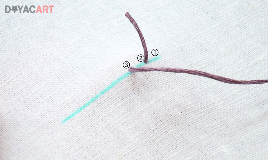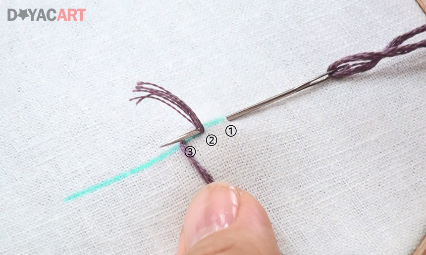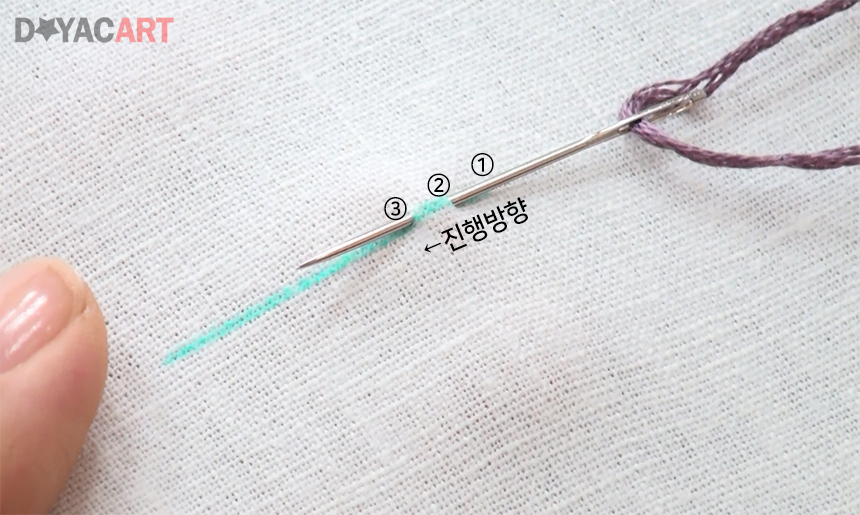 1. 매듭을 짓지 않은 바늘을 시작점보다 한 땀 앞(②)에서 위에서 아래로 넣어 한 땀(③) 떠주세요.