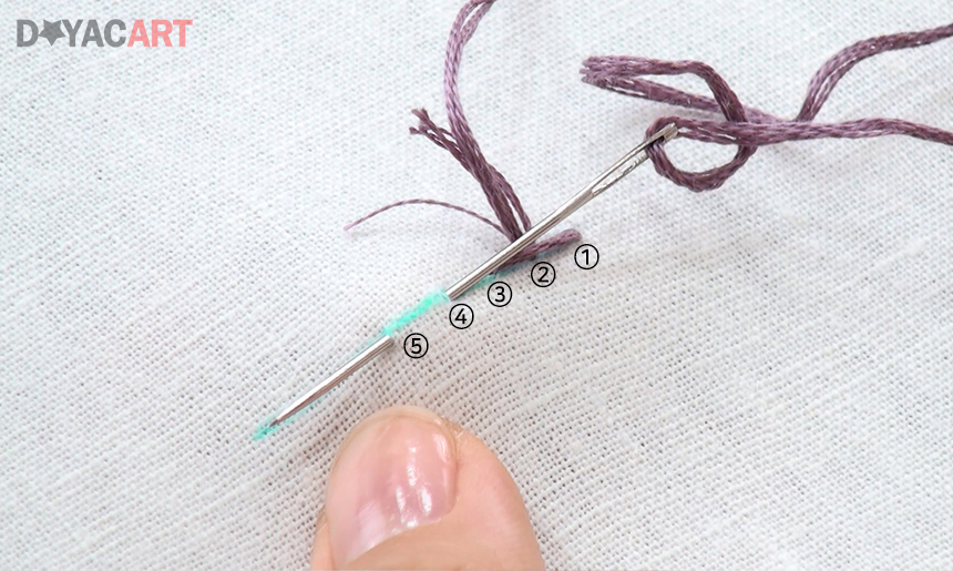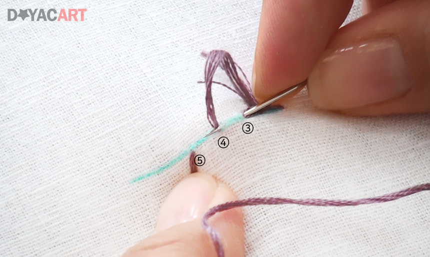 5. ③ 기준으로 한 땀을 비우고 ④에서 바늘을 넣어 한 땀(⑤) 떠주세요.