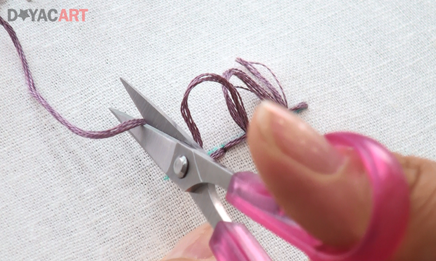 9. 마무리 할 때는 매듭을 짓지 말고 실이 원단 위에 있는 상태에서 앞서 남긴 실과 같은 길이 만큼 남기고 가위로 잘라냅니다.