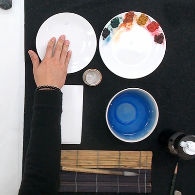 먹과 물의 농담을 만들어내기 위한 접시, 그리고 수묵 담채를 그린다면 채색 접시가 필요합니다. 채색 접시의 경우에는 필요한 물감을 미리 짜둔 다음 말린 상태에서 조금씩 사용하면 좋습니다. 서양화의 팔레트 역할이죠.