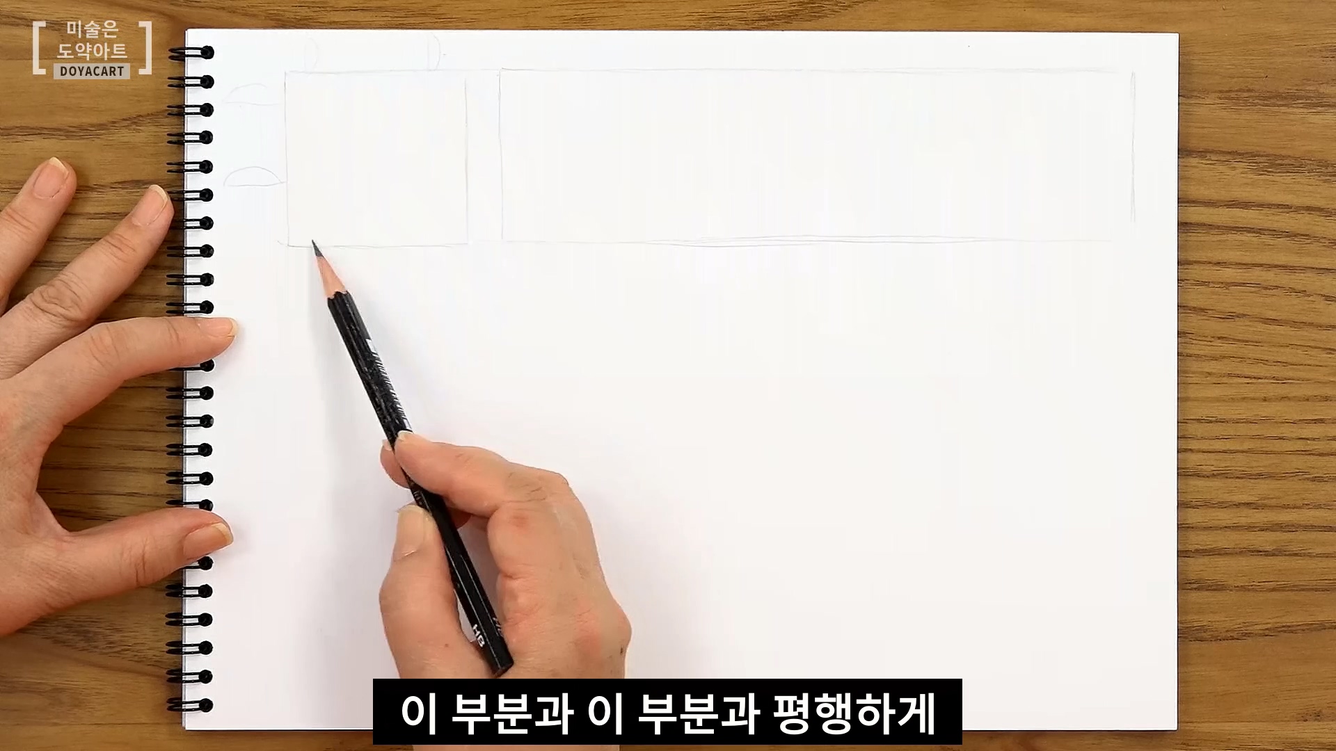 먼저, 사각형 몇 개를 그려놓고 이 안에 선을 그어보겠습니다. 사각형을 그리다 보면 기울어지거나 삐뚤빼뚤해지거나 아니면 구부러지는 경우가 있어요.이때, 직선을 곧게 그리는 팁은 바로! 스케치북의 가장자리를 이용하는 거예요. 스케치북의 가장자리와 선을 평행하게 그어줍니다. 가장자리와 펜의 간격도 신경 써주세요! 이렇게 그어주면 곧은 선을 가진 사각형 완성! 참 쉽죠? ^^