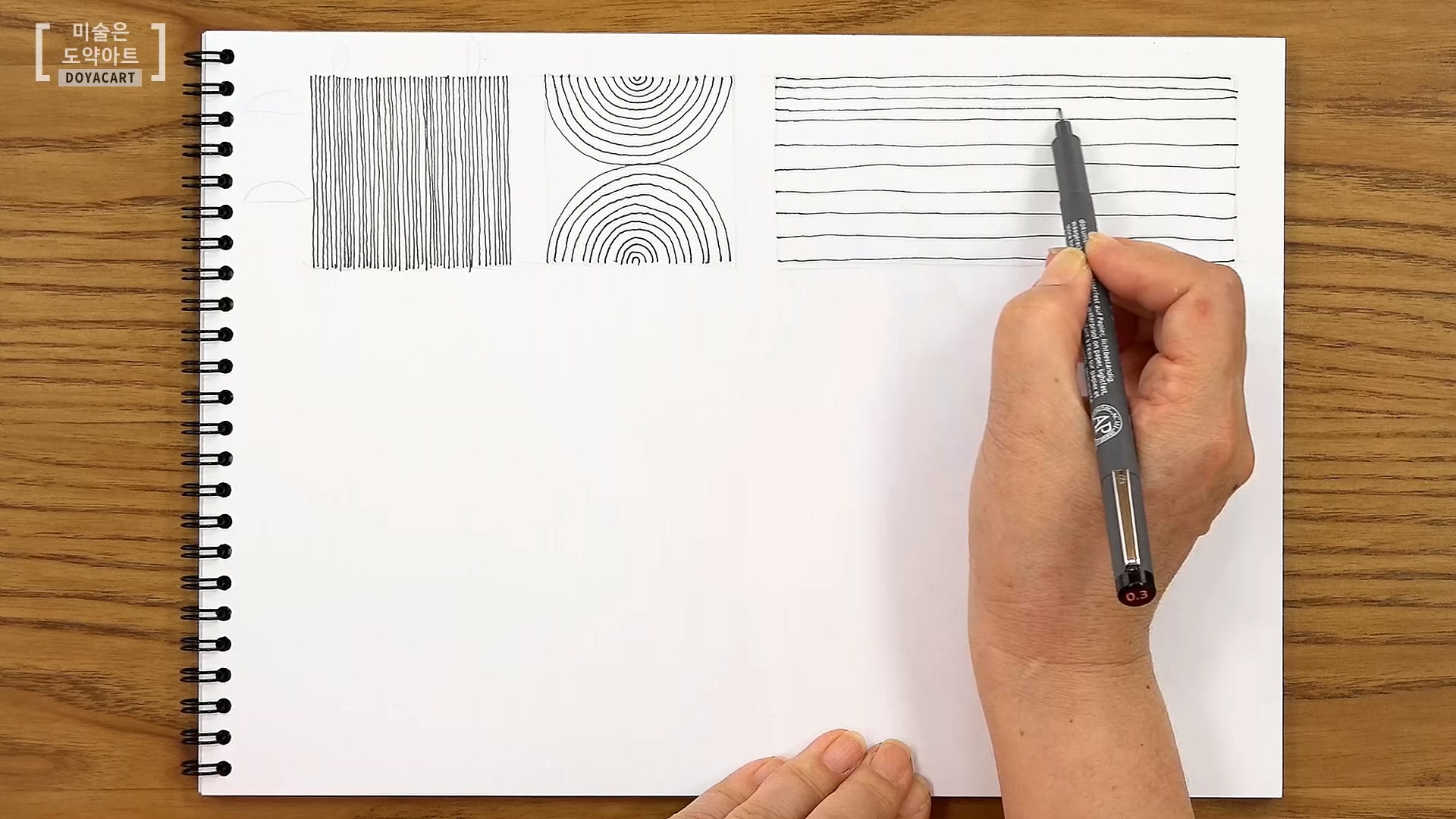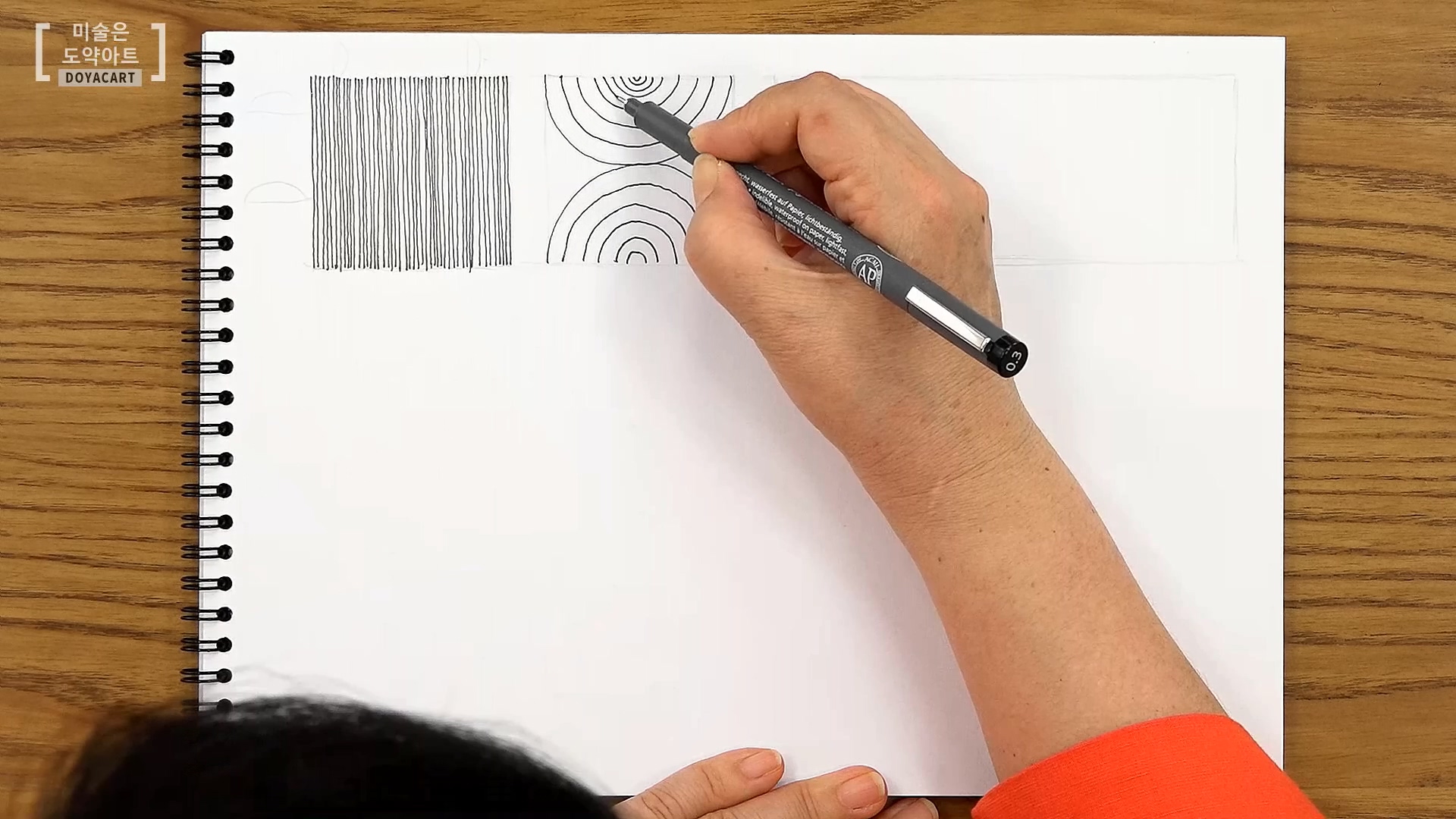 여러분 펜 드로잉 할 때 직선만 쓰시 않으시죠? 우리가 그림을 그리다 보면 곡선도 많이 쓰고 원형의 형태도 많이 그리게 되고 다양한 선을 쓰게 됩니다. 그래서 다양한 형태의 선도 연습해 주셔야 해요. 반원을 사각형 안에 듬성듬성 다양한 크기로 그려줍니다. 그다음 그 선들의 사이를 채워가면서 반원을 그려주세요. 이때, 간격을 일정하게 유지시켜 그리도록 집중하시는 게 가장 중요해요!