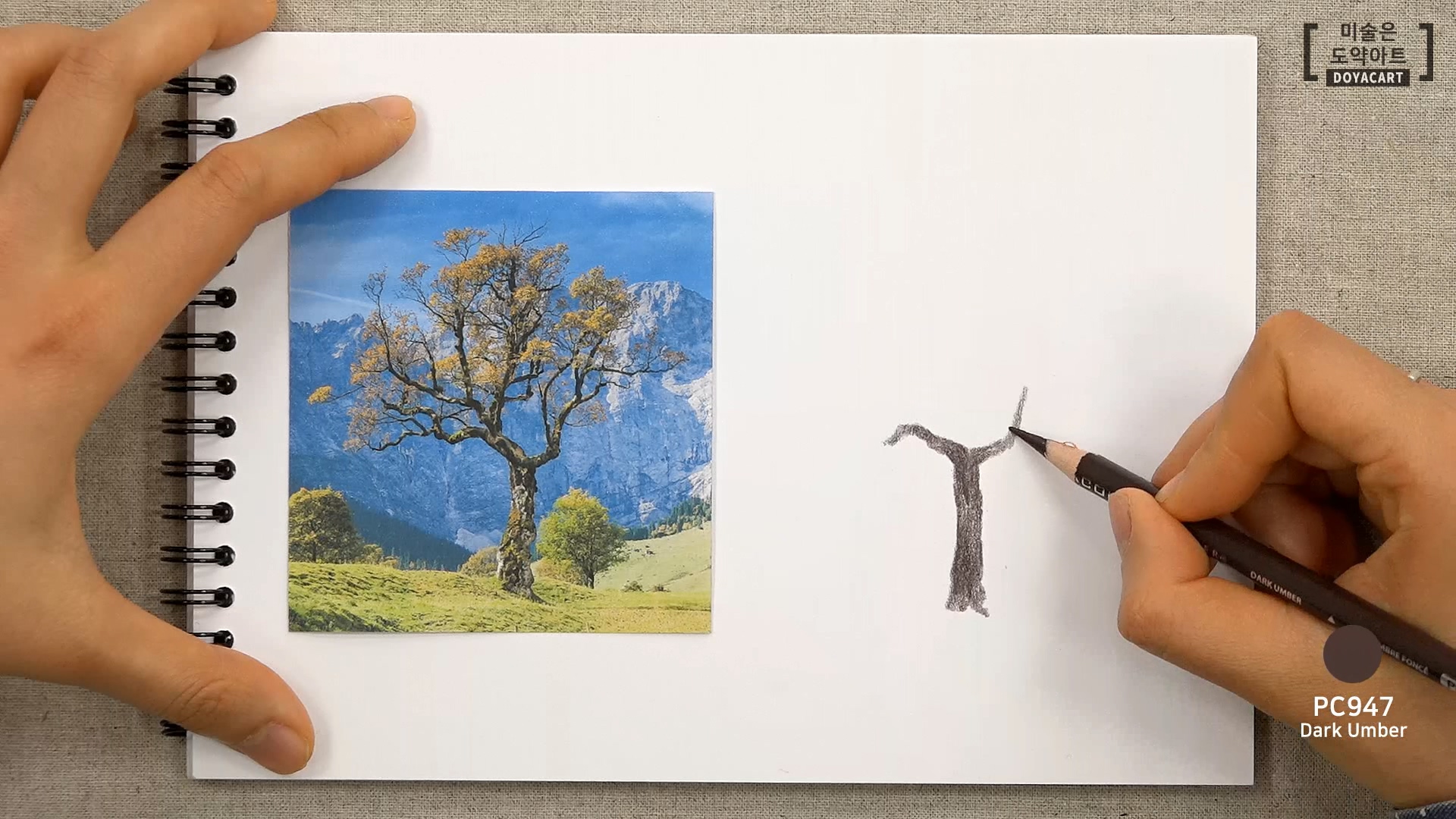 나무 기둥을 그릴 때, 주의해야 할 포인트가 있습니다! 나무 기둥을 자세히 관찰하면 직선으로 쭉 뻗은 것처럼 되어 있는데요. 약간 휘어지는 듯한 느낌을 살리는 것이 중요합니다. 그다음에는 잔 가지가 나가는 것을 굴곡을 표현하며 그려주세요.