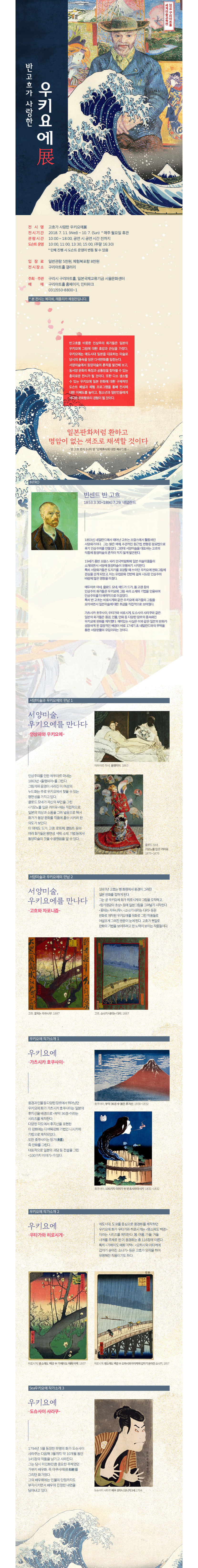 반고흐를 비롯한 인상주의 화가들은 일본의 우키요에 그림에 대한 호감과 관심을 가졌습니다. 우키요에는 에도시대 일본을 대표하는 미술로 당시의 풍속을 담은 다색판화를 일컫는 말입니다. 서양미술에서 동양미술의 흔적을 발견해 보고, 동서양 문화의 특징과 공통점을 찾아볼 수 있는 흥미로운 전시가 될 것입니다. 또한 다소 생소할 수 있는 우키요에 일본 판화에 대한 청소년과 일반인들에게 색다른 문화향유의 경험이 될 것입니다.