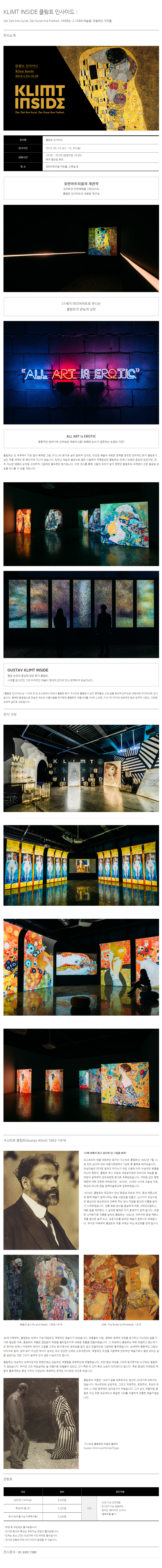 클림트는 전 세계에서 가장 많이 복제된 그림 <키스>의 화가로 널리 알려져 있지만, 이것은 예술의 새로운 영역을 창조한 전위적인 화가 클림트가 남긴 작품 세계의 한 페이지에 지나지 않습니다. 뛰어난 재능과 열정으로 젊은 시절부터 주목받았던 클림트는 언제나 논쟁의 중심에 있었지만, 정작 자신은 태풍의 눈처럼 고요하게 그림에만 몰두했던 화가입니다. 이번 전시를 통해 그동안 우리가 알지 못했던 클림트의 세계관이 깃든 황금빛 관능을 만나볼 수 있을 것입니다.