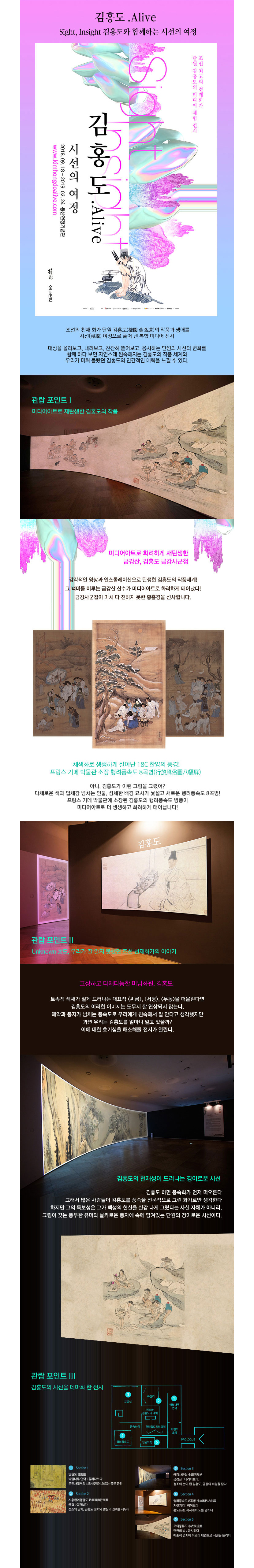 조선의 천재 화가 단원 김홍도의 작품과 생애를 시선 여정으로 풀어낸 복합 미디어 전시입니다. 대상을 올려보고, 내려보고, 천천히 뜯어보고 응시하는 단원의 시선 변화를 함께 하다 보면 자연스레 원숙해지는 김홍도의 작품 세계와 우리가 미처 몰랐던 김홍도의 인간적인 매력을 느낄 수 있습니다. 김홍도의 시선을 테마화 한 전시! 우리가 잘 알지 못했던 조선 천재화가의 이야기가 미디어아트로 더 생생하고 화려하게 태어납니다.