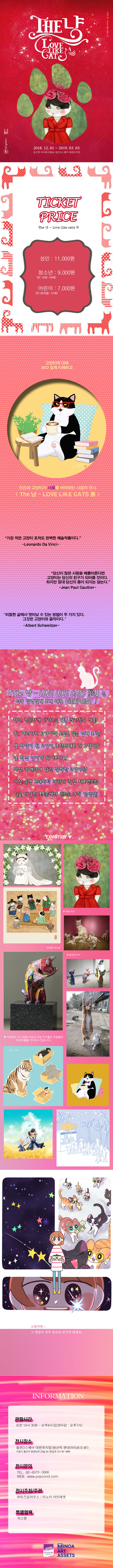 이번 전시회는 복합장르의 체험 전시회로 동시대 사람들에게 가장 많은 사랑을 받고 있는 반려동물인 '고양이'를 소재로 '인간과 동물의 상생'이라는 메시지를 담고 있습니다. 그래피티 아티스트 '닌 볼트'와 웹툰 작가 '스노우캣' 등 '고양이'를 소재로 작품 활동을 한 최고 아티스트 14인의 작품 120여점을 만나볼 수 있습니다. 당신의 #냥스타그램 을 책임질 비주얼 고양이들의 총 집결! 웹툰작품 및 아트프린팅 영상랩핑, 조각, 설치 등 다양한 형태의 작품을 통해 고양이에 대해 보다 깊게 이해하고 인간과 고양이가 서로를 바라보는 시점의 전시회입니다.