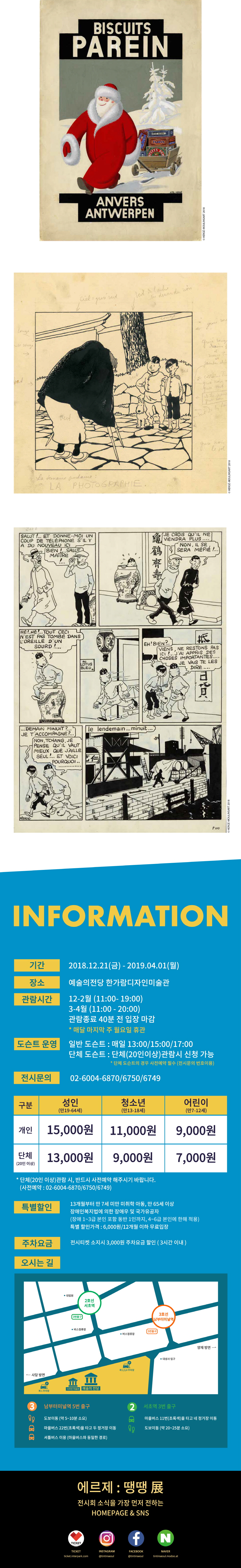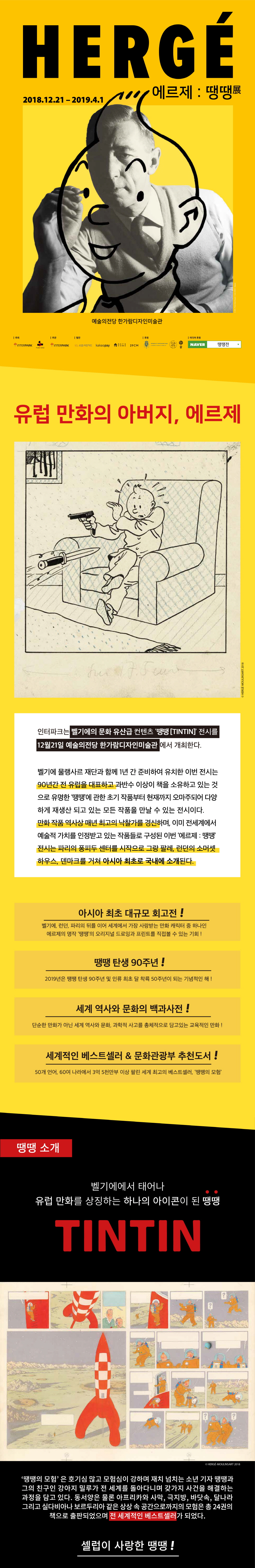 90년간 유럽을 대표한 만화 '땡땡의 모험'의 작가 에르제를 조명하고, '땡땡(TinTin)'의 탄생 90주년을 기념하는 에르제 : 땡땡展이 2018년 12월 21일(금)부터 2019년 4월 1일(월)까지 한가람 미술관에서 열립니다! 세계 역사와 문화의 백과사전이라 불리는 '땡땡의 모험'은 만화 작품 역사상 최고 낙찰가, 50개 언어로 출간되어 60여개 나라에서 3억부 이상 팔린 세계적인 베스트셀러에 이르기까지 화려한 기록들을 남겼습니다.
