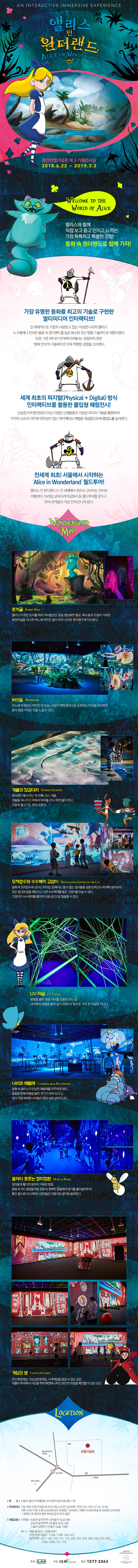 가장 유명한 동화를 최고의 기술로 구현한 멀티미디어 인터랙티브! 전 세계적으로 꾸준히 사랑받고 있는 '이상한 나라의 앨리스'. 누구에게나 친숙한 동화 속 원더랜드를 높은 화소의 최신 맵핑 기술력으로 재현시켰다. 또한 기존 미디어 인터랙티브에서는 경험하지 못한 '형태 인식'의 기술력으로 더욱 특별한 경험을 선사합니다.