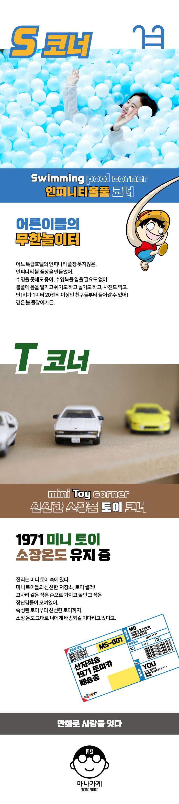 마나가게는 <만화로 사람을 잇다>라는 철학을 가지고 만화와 관련된 것을 모으고, 만드는 브랜드입니다. 마나가게 춘천은 상품을 신선하게 보관하고 판매하는 대형마트에 영감을 얻어 신헌한 만화 콘텐츠의 전시, 판매 그리고 휴식공간 제안이라는 콘셉트로 기획되었습니다. <만화로 사람을 잇다>는 브랜드 철학을 확실히 보여주는 공간을 만들고자 70~80년대부터 현재까지 시대를 풍미했던 만화 콘텐츠와 제품을 가지고, 세대를 아우르는 가치와 경험을 제공하려 합니다. 만화라는 즐거운 콘텐츠를 마나가게 춘천에서 쇼핑하세요.