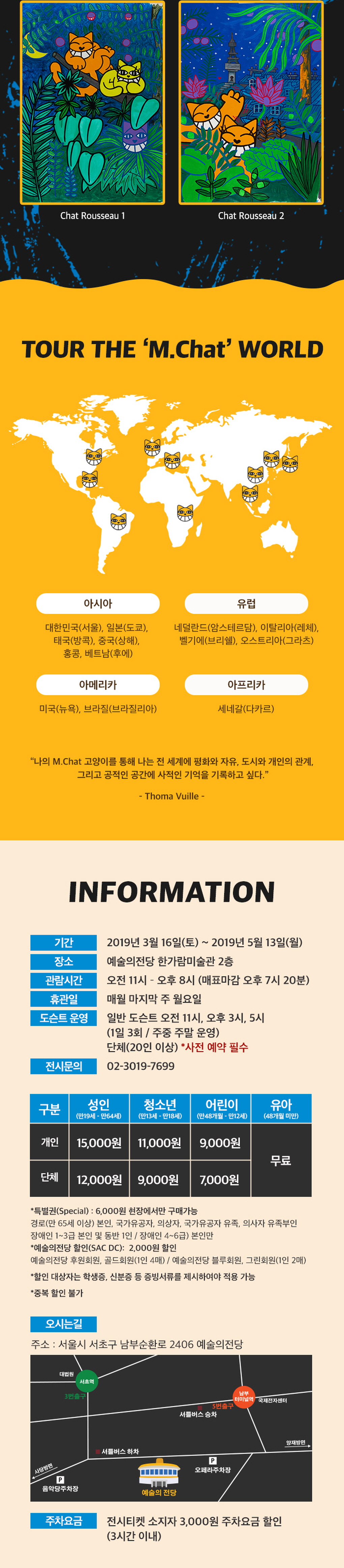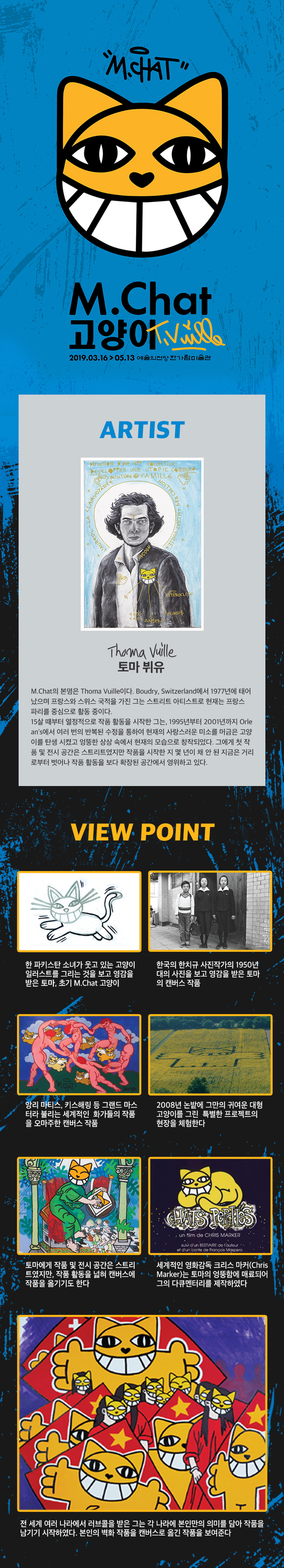 아무것도 모른 척 순수한 눈으로 우리를 바라보는 M.Chat 고양이의 즐겁고 긍정적인 모습을 담은 이번 전시는 숨 가쁜 삶을 살아가고 있는 우리 한국의 젊은이들과 꿈과 희망을 품고 자라나는 어린이들, 그리고 본 전시를 관람하는 관람객들뿐만이 아닌 전 세계인들에게 관람하는 매 순간 즐거움과 긍정적인 영향을 주고자 기획됐다. M.Chat 고양이만이 가지고 있는 무한한 긍정효과를 느껴볼 수 있는 이번 전시에서는 토마 뷔유의 초기작부터 다양한 컨셉과 스타일로 제작된 작품이 공개된다. 전시가 시작되는 3월 중순에는 토마뷔유가 직접 내한해 작가가 가지고 있는 순수함과 열정, 그리고 작가의 창의적이고 뛰어난 상상력까지 함께 경험해 볼 수 있는 뜻깊은 행사가 진행될 예정이다. 이번 전시를 통해 길거리에서 시작된 그의 작품 활동이 거리를 벗어나 보다 확장된 공간에서, 보다 무한한 상상력으로 펼쳐지는 것을 많은 이들이 경험하길 바란다.