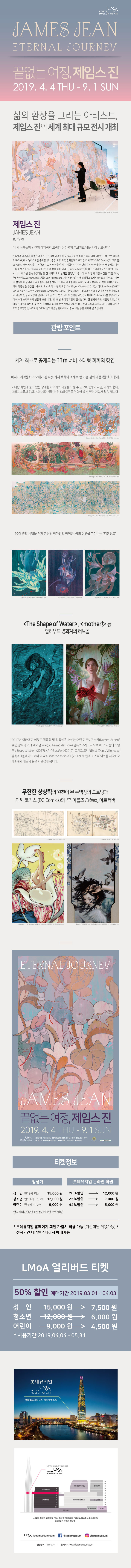 1979년 대만에서 출생한 제임스 진은 3살 되던 해 미국 뉴저지로 이주해 현재 로스엔젤레스를 기반으로 다양한 작업을 보여주고 있습니다. 제임스 진은 뉴욕의 미술 명문인 스쿨 오브 비주얼 아츠(SVA)에서 일러스트를 수학하고, 이후 2001년부터 미국 만화산업을 대표하는 디씨 코믹스(DC Comics)의 <페이블즈 Fables> 커버 작업을 시작하면서 그의 명성을 쌓기 시작합니다. 2019년 롯데뮤지엄에서 개최되는 이번 전시는 그의 첫 번째 대규모 회고전으로, 20년간 종횡무진 펼쳐온 독특한 그의 예술세계를 한 자리에서 볼 수 있는 가장 좋은 기회가 될 것입니다.