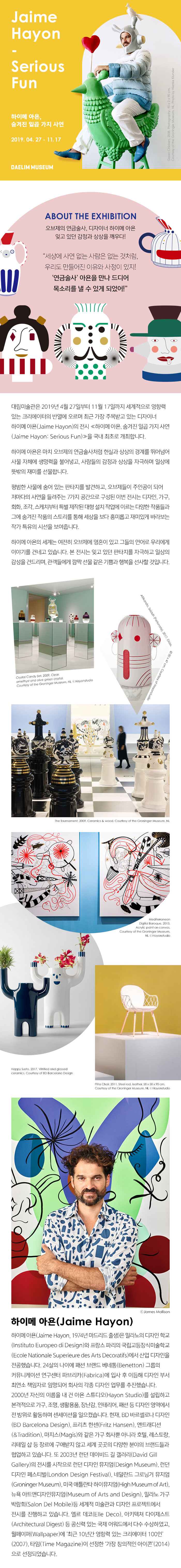 대림미술관은 2019년 4월 27일부터 11월 17일까지 세계적으로 영향력 있는 크리에이터의 반열에 오르며 최근 가장 주목받고 있는 디자이너 하이메 아욘(Jaime Hayon)의 전시 ≪하이메 아욘, 숨겨진 일곱 가지 사연 (Jaime Hayon: Serious Fun)≫을 국내 최초로 개최합니다.