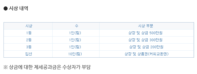 - 참여 작품 수 및 작품의 품질 등의 사유로 상금 및 수상인원은 변동될 수 있으며 상금에 대한 제세공과금은 수상자가 부담한다.