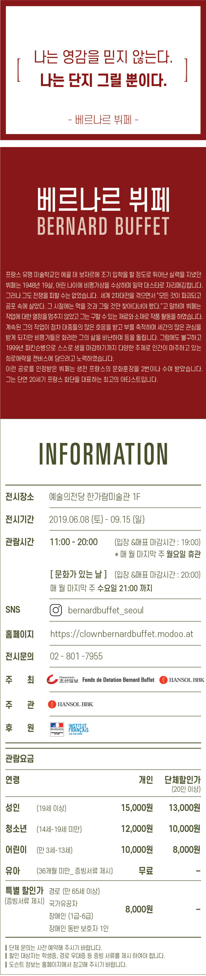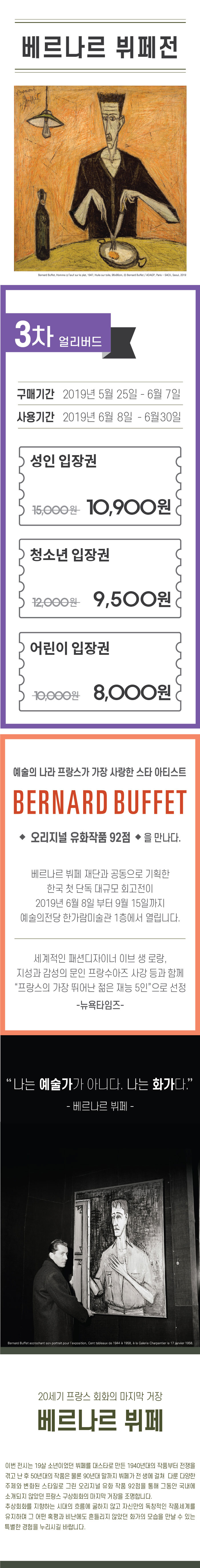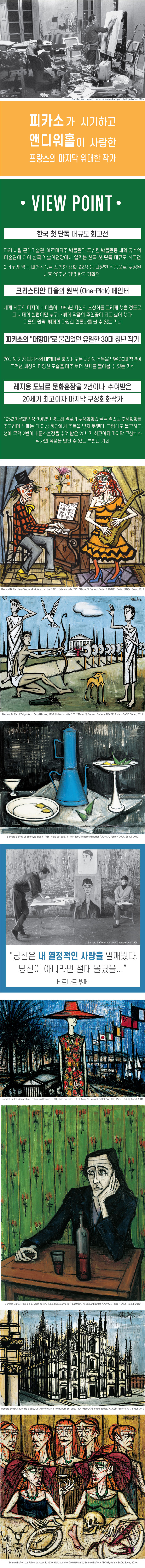 베르나르 뷔페 재단과 공동으로 기획한 한국 첫 단독 대규모 회고전이 2019년 6월 8일부터 9월 15일까지 예술의 전당 한가람 미술관 1층에서 열립니다. 20세기 프랑스 회화의 마지막 거장, 베르나르 뷔페! 이번 전시는 19살 소년이었던 뷔페를 대스타로 만든 1940년대의 작품부터 전쟁을 겪고 난 후 50년대의 작품은 물론 90년대 말까지 뷔페가 전 생에 걸쳐 다룬 다양한 주제와 변화된 스타일로 그린 오리지널 유화 작품 92점을 통해 그동안 국내에 소개되지 않았던 프랑스 구상회화의 마지막 거장을 조명합니다.