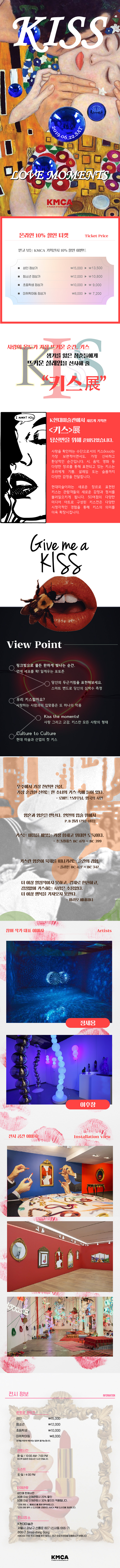 사랑을 확인하는 수단으로서의 키스(KISS)는 가장 보편적이면서도 가장 신비하고 환상적인 순간입니다. 시, 음악, 영화 등 다양한 장르를 통해 표현되고 있는 키스는 우리에게 기쁨, 설레임 또는 슬픔까지 다양한 감정을 전달합니다. 현대미술이라는 새로운 장르로 표현된 키스는 관람객들의 새로운 감정과 정서를 불러일으키게 됩니다. 50여점의 다양한 미디어 아트로 구성된 키스전은 다양한 시청각적인 경험을 통해 키스의 의미를 더욱 확장시킵니다.