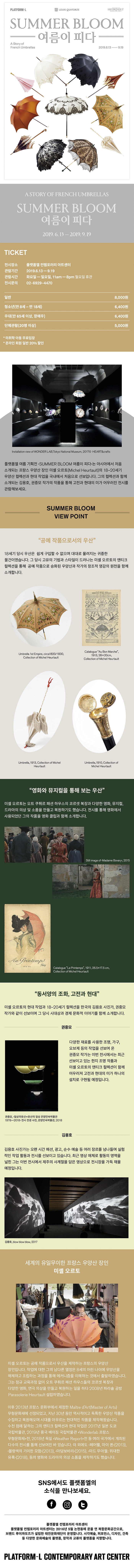 플랫폼엘 여름 기획전 <SUMMER BLOOM 여름이 피다>는 아시아에서 처음 소개되는 프랑스 우양산 장인 미셸 오르토(Michel Heurtault)의 18-20세기 우양산 컬렉션과 현대 작업을 국내에서 처음으로 선보입니다. 그의 컬렉션과 함께 소개되는 김용호, 권중모 작가의 작품을 통해 고전과 현대의 미가 어우러진 전시를 관람해보세요.