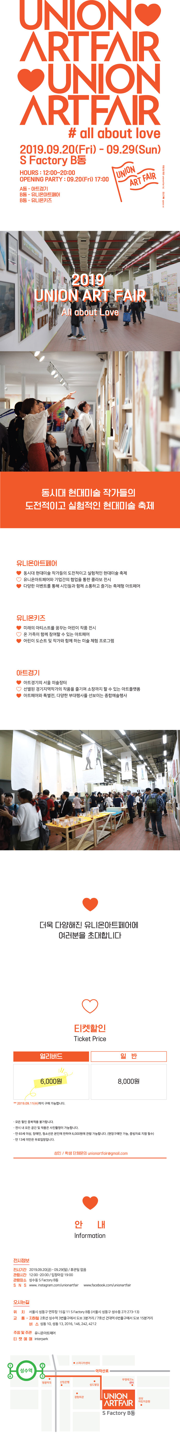 동시대 현대미술 작가들의 도전적이고 실험적인 현대미술 축제! 9월 20일, 성수동 S팩토리에서 2019 유니온아트페어가 시작됩니다. 에스팩토리 B동에서 열리는 유니온아트페어 219명의 작가님들의 1200여점에 달하는 다양한 작품과 함께 S팩토리 A동에서 열리는 아트경기X유니온아트페어도 함께 만나보세요.