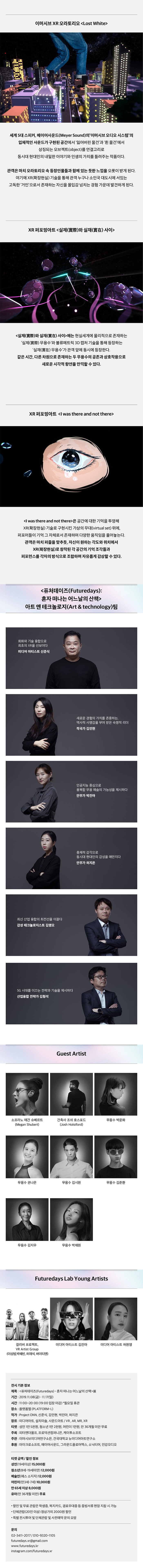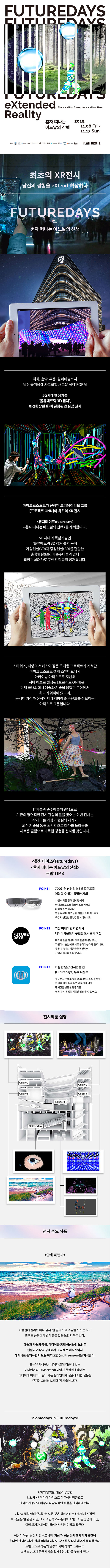 최초의 XR전시! 당신의 경험을 eXtend 확장하다! 마이크로소프트가 선정한 크리에이티브 그룹 [프로젝트 ONN]이 최초의 XR전시 <퓨처데이즈> 혼자 떠나는 어느날의 산책을 개최합니다. 5G 시대의 핵심기술인 '볼류메트릭 3D 캡처'를 이용해 가상현실(VR)과 증강현실<AR>을 결합한 혼합현실(MR)이 순수미술과 만나 확장현실(XR)로 구현된 작품이 공개됩니다.