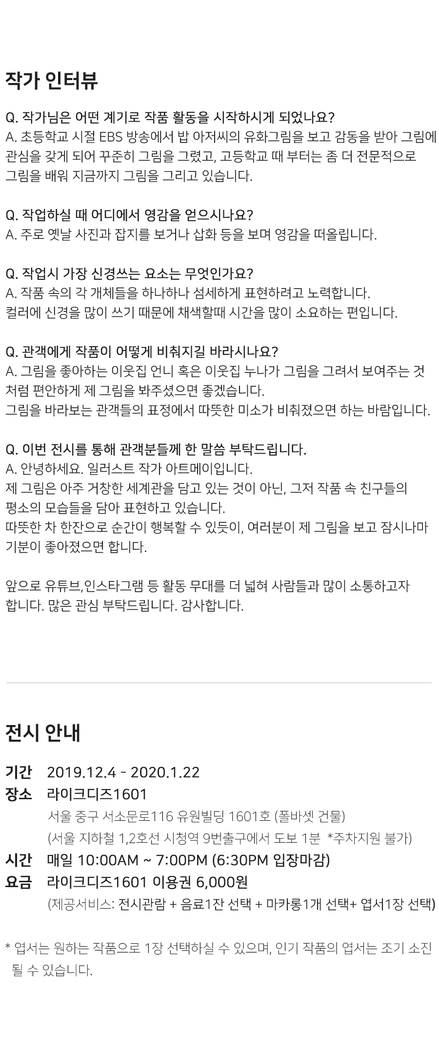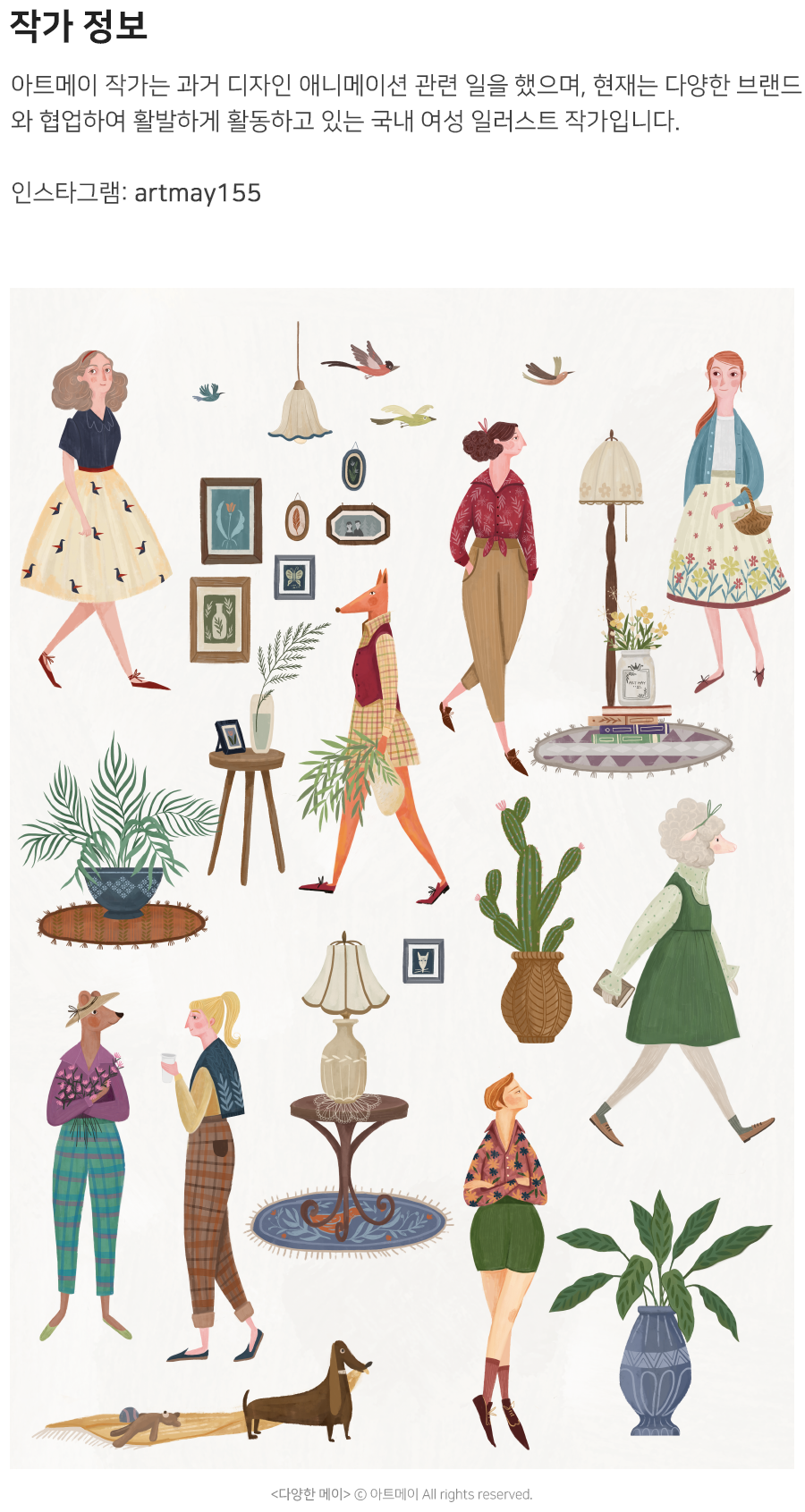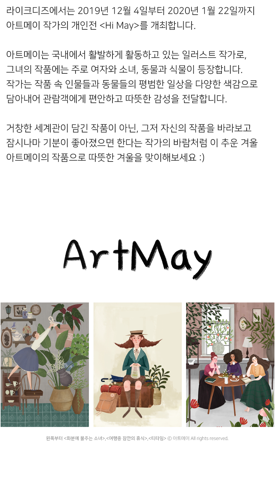 아트메이는 국내에서 활발하게 활동하고 있는 일러스트 작가로, 그녀의 작품에는 주로 여자와 소녀, 동물과 식물이 등장합니다. 작가는 작품 속 인물들과 동물들의 평범한 일상을 다양한 색감으로 담아내어 관람객에게 편안하고 따뜻한 감성을 전달하고 싶다고 하는데요. 거창한 세계관이 담긴 작품이 아닌, 그저 자신의 작품을 바라보고 잠시나마 기분이 좋아졌으면 한다는 작가의 바람처럼 이 추운 겨울 아트메이의 작품으로 따뜻한 겨울을 맞이하시면 좋을 것 같습니다.