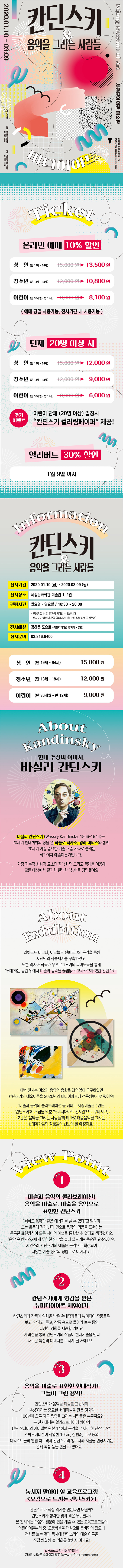 바실리 칸딘스키(Wassily Kandinsky, 1866-1944)는 20세기 현대회화의 장을 연 파블로 피카소, 앙리 마티스와 함께 20세기 가장 중요한 예술가 중 하나로 불리는 화가이자 예술이론가입니다. 그는 가장 기본적 회화적 요소인 점/선/면 그리고 색채를 이용해 모든 대상에서 탈피한 완벽한 '추상'을 정립했는데요. 이번 전시는 미술과 음악의 융합을 끊임없이 추구하였던 칸딘스키의 예술이론을 2020년의 미디어아트에 적용했다고 합니다. '미술과 음악의 콜라보레이션'을 테마로 세종미술관 1관은 '칸딘스키'에 초점을 맞춘 '뉴미디어아트 전시관'으로 꾸며지고, 2관은 '음악을 그리는 사람들'의 테마로 대중음악을 그리는 현대작가들의 작품이 선보여 질 예정이라고 합니다.