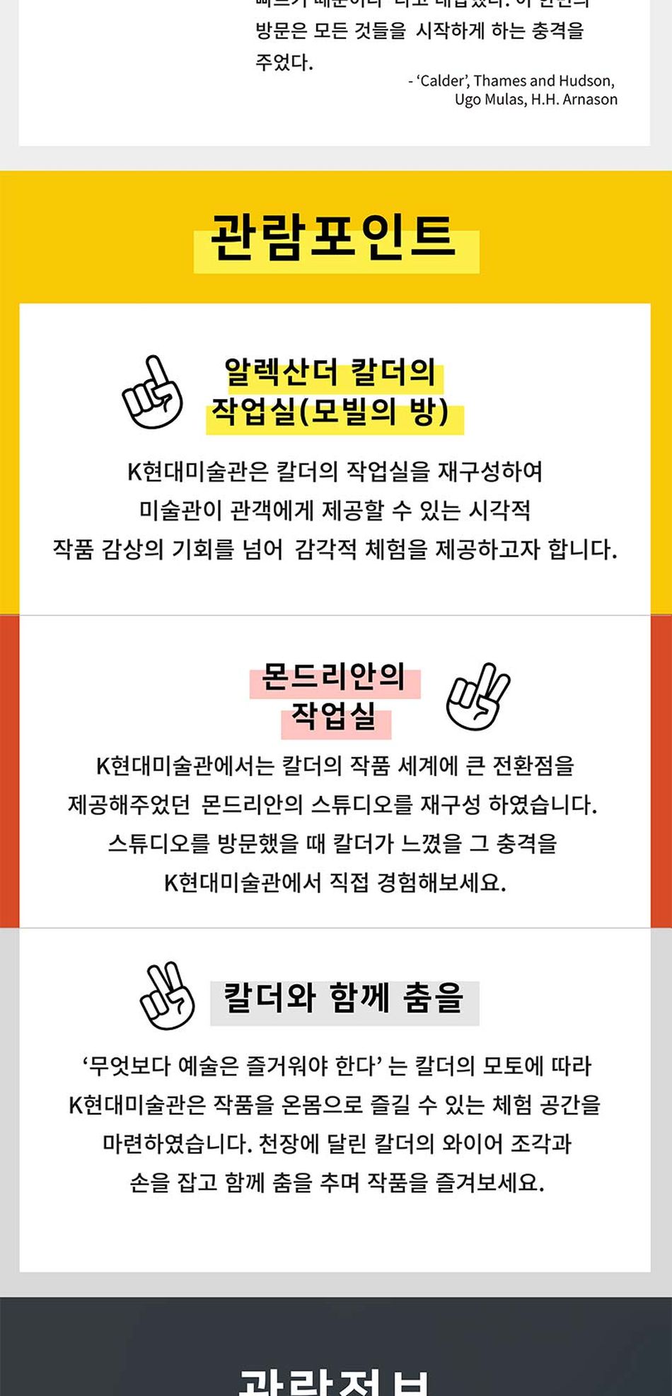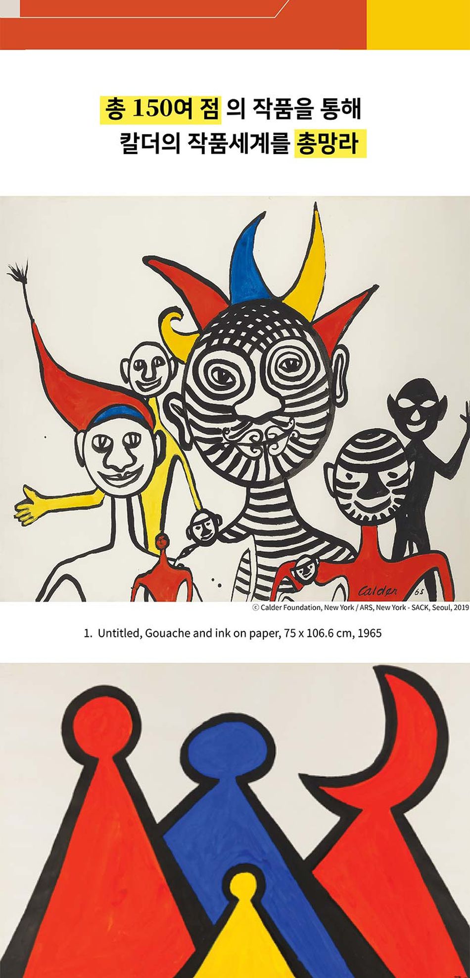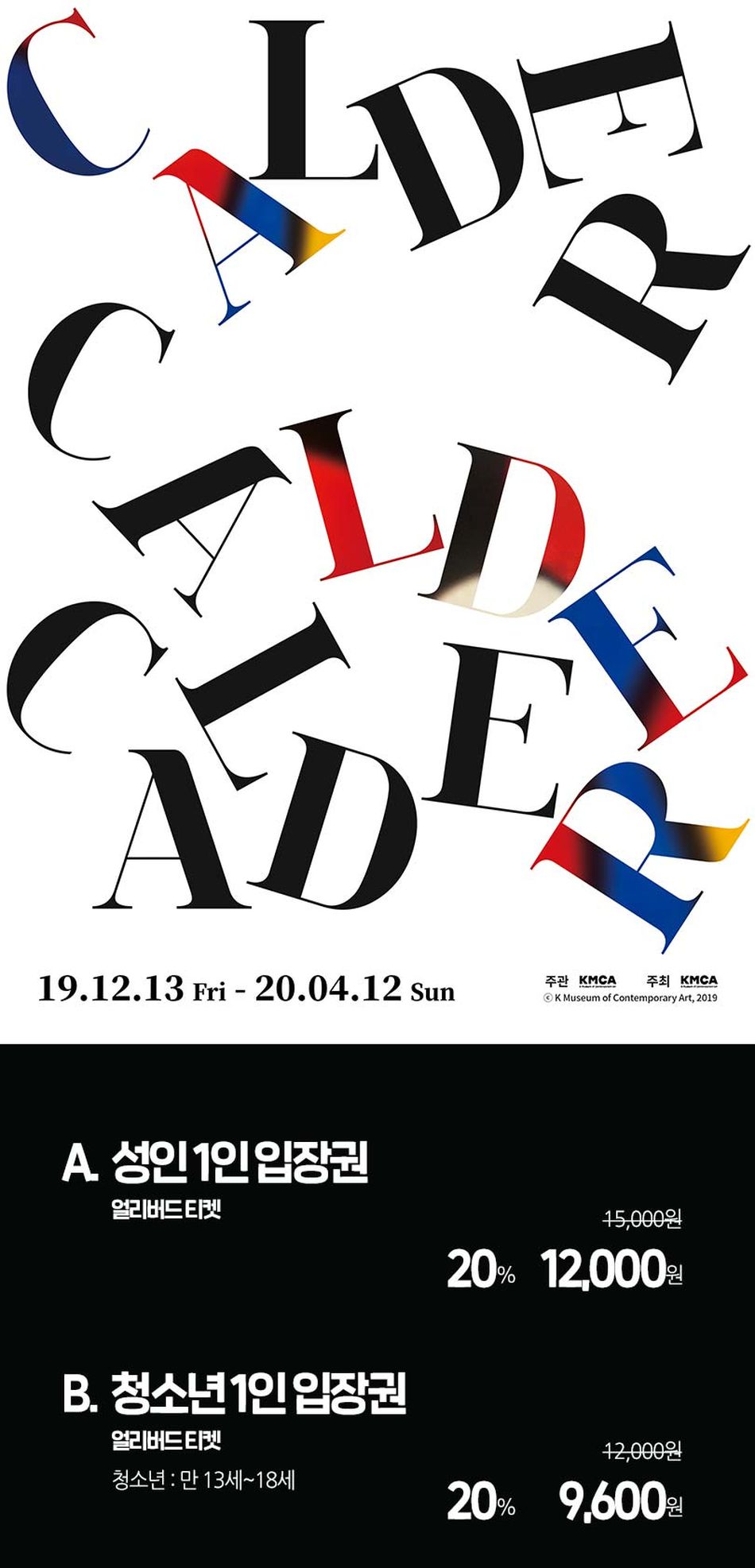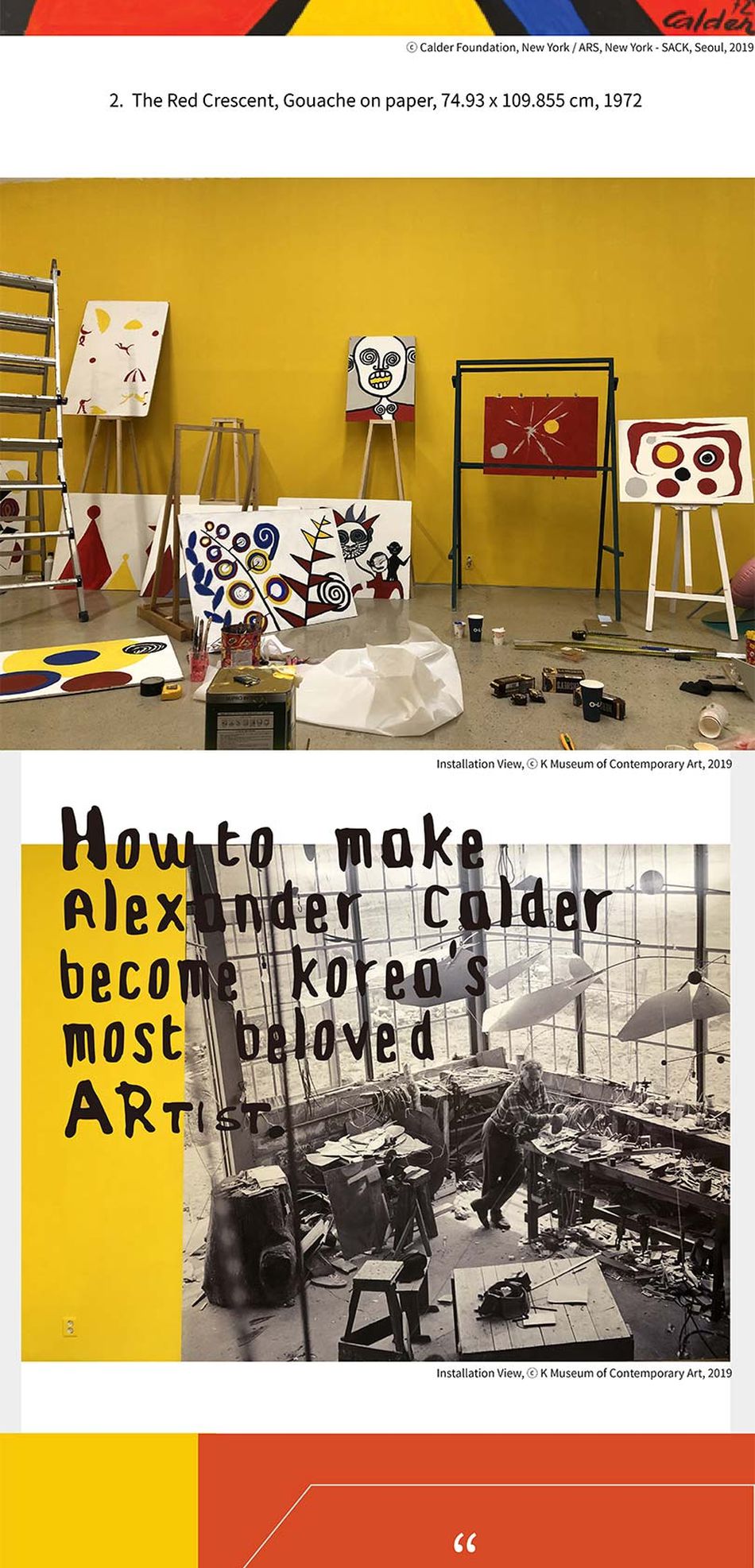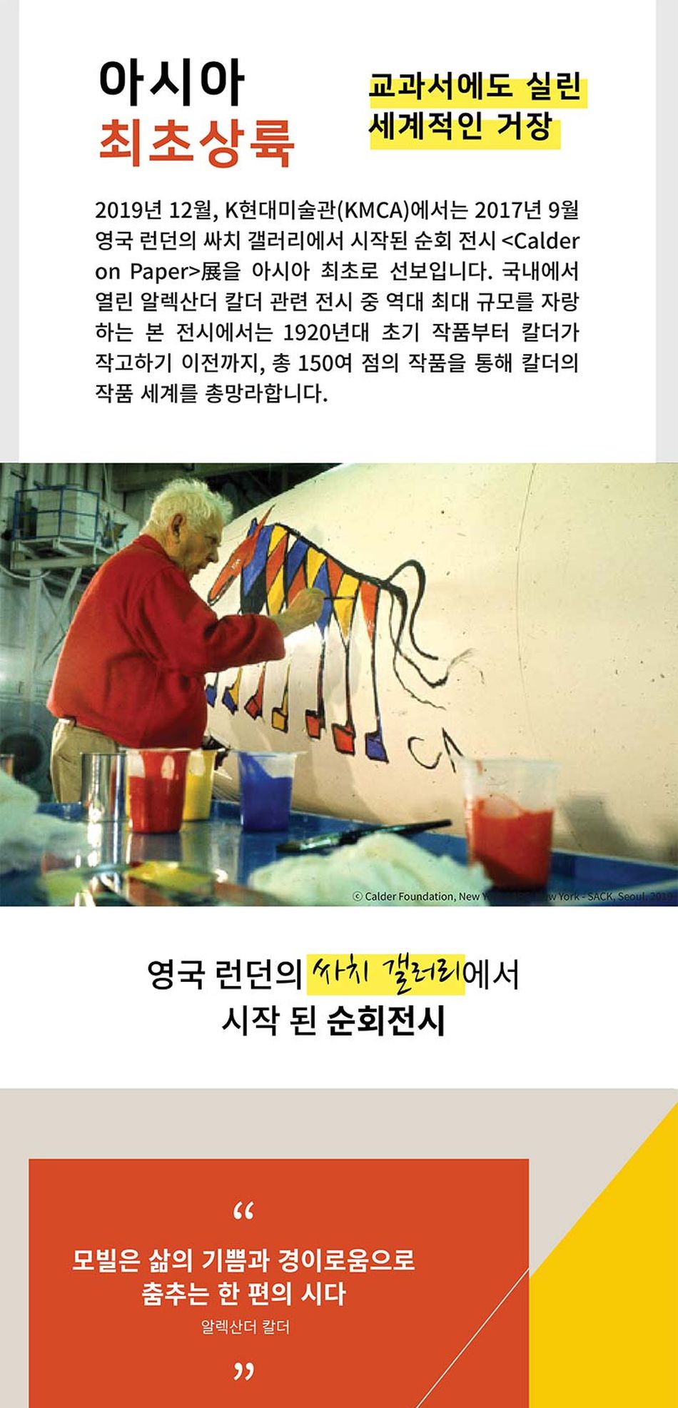 2019년 12월 13일, K 현대 미술관 (KMCA)에서는 2017년 9월 영국 런던의 싸치 갤러리에서 시작된 순회 전시 "Calder on Paper" 展 을 아시아 최초로 선보입니다. 국내에서 열린 알렉산더 칼더 관련 전시중 역대 최대 규모를 자랑하는 본 전시에서는 1920년대 초기 작품부터 칼더가 작고하기 이전까지, 150여 점의 작품을 통해 칼더 작품 세계를 총망라합니다.