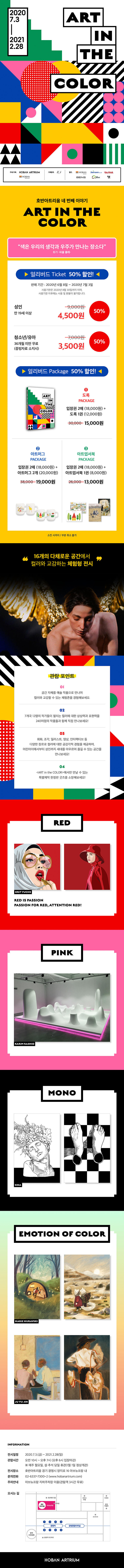 이스라엘, 러시아, 대만, 홍콩 등 7개국 12인의 아티스트의 240여점을 선보이는 대규모 전시를 통해 컬러에 대한 각기 다른 작가의 철학을 함께 나눠보세요. 희화와 조각, 일러스트, 미디어, 인터랙티브에 이르기까지 다양한 장르의 작품들을 경험할 수 있습니다. 이번 전시에는 작가와 함께 컬러에 대한 섬세하고 진지한 고민을 나누며 기획한 16개의 전시 공간이 마련되어 있는데요. 남녀노소 누구나 즐길만한 체험 프로그램과 함께 컬러를 통해 세상을 보는 시각을 환기하는 기회를 가져보세요.