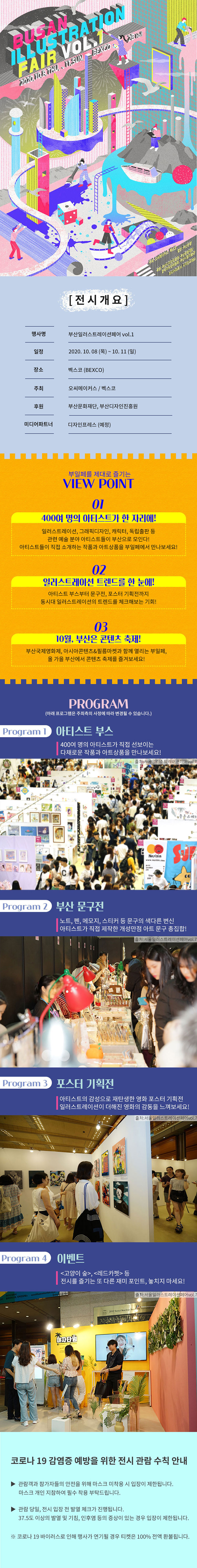 일러스트레이션, 그래픽디자인, 캐릭터, 독립출판 등 관련 예술 분야 아티스트들이 부산으로 모인다! 400여 명의 아티스트들이 직접 소개하는 작품과 아트상품을 만나보실 수 있습니다. 또한, 아티스트 부스부터 문구전, 포스터 기획전까지 동시대 일러스트레이션의 트렌드를 체크해볼 수 있는 기회까지 있는 이번 전시회, 올가을 부산에서 즐겨보세요!