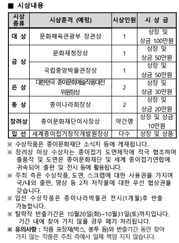 - 작품컬러사진1매(3"x5"), 출품원서 (종이나라박물관 홈페이지에서 다운받아 작성)