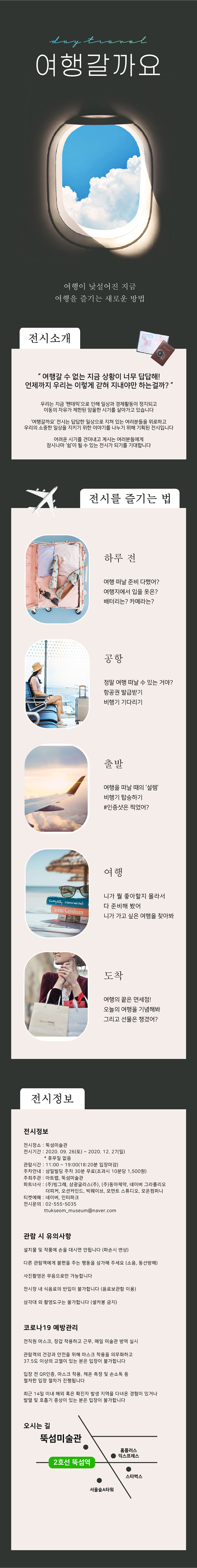 여행이 낯설어진 지금, 여행을 즐기는 새로운 방법을 체험할 전시회를 소개합니다. 일상과 경제활동이 정지되거나 이동의 자유가 제한된 암울한 시기를 살고 있는 지금, 이번 전시는 답답한 일상으로 지쳐있는 여러분들을 위로하고 우리의 소중한 일상을 지키기 위한 이야기를 나누기 위해 기획된 전시입니다. 어려운 시기를 견뎌내고 계시는 여러분들에게 잠시나마 '쉼'이 될 수 있는 전시가 되기를 기대합니다.