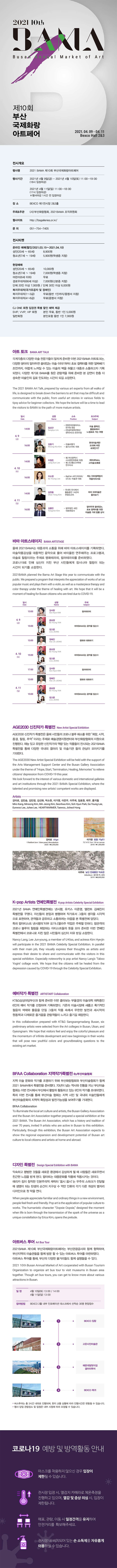 오는 4월 9일부터 11일까지 부산 벡스코 제1 전시관 2,3홀에서 제10회 2021 BAMA를 개최한다고 15일 밝혔습니다. 또한 아이돌과 모델 작가들의 작품을 소개하는 연예인 특별전 'K-POP ARTISTS'도 구상하고 있다고 하는데요. 시민과의 소통을 강조하는 차원에서 '아트 스테이지'를 만들어 토크 프로그램과 공연도 한다고 하니 여러분들도 풍성한 아트페어를 느껴보시기 바랍니다. 마지막으로 저희 '도약닷컴'에서 강의하시는 선생님분들께서도 참가하시니 적극적인 관심과 참여 부탁드립니다.