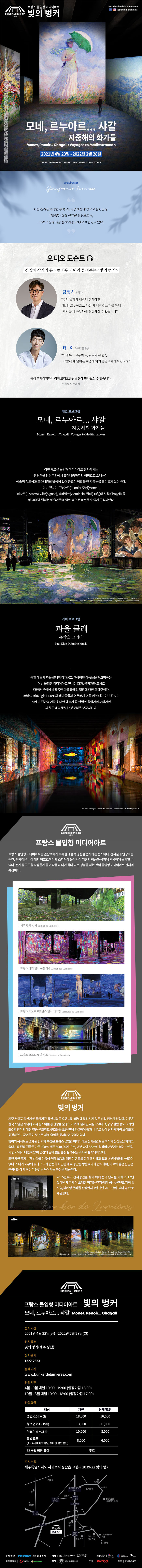 이번 몰입형 미디어아트 전시 <모네, 르누아르... 샤갈> 전시는 관람객을 인상주의에서 모더니즘까지의 여정으로 초대한다고 합니다. 또한, 예술적 창조성과 모더니즘의 발생에 있어 중요한 역할을 한 지중해를 살펴본다고 하는데요. 르누아르(Renoir), 모네(Monet), 피사로(Pissarro), 시냑(Signac), 드랭(Derain), 블라맹크(Vlaminck), 뒤피(Dufy)와 샤갈(Chagall) 등 약 20명에 달하는 예술가들의 명화 속으로 빠져들 수 있게 구성했다고 하니 빛의 벙커에서 직접 감상해 보시길 바라겠습니다.