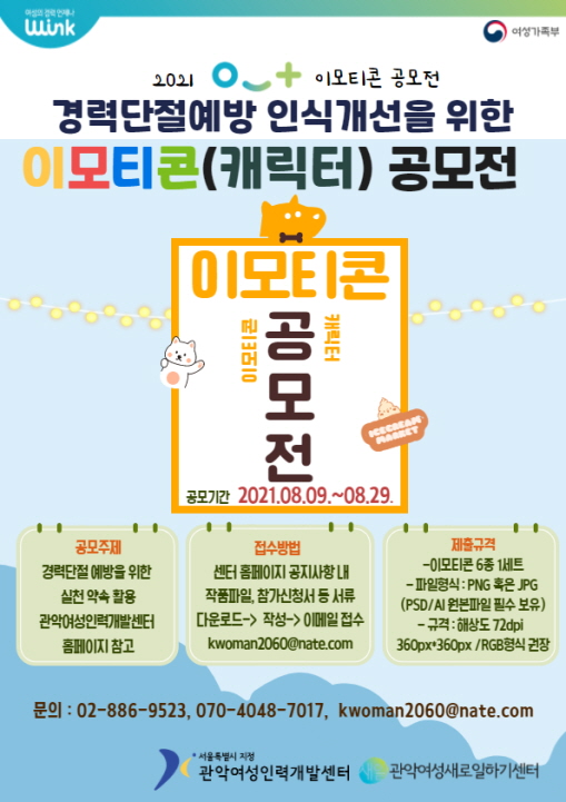 - 수상작은 향후 ‘경력단절예방 홍보 굿즈’ 제작과 배포에 활용할 예정이며 관악여성인력개발센터 홈페이지・SNS・책자 등 센터 홍보물에 사용할 수 있음.