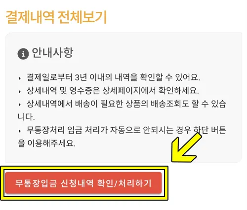 2) 그 다음 [무통장입금 신청내역 확인/처리하기] 버튼을 클릭합니다.