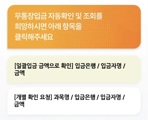 1) 먼저, 입금하신 [은행명]과 [입금자명]이 신청하신 내역과 같은지 확인해 주시기 바랍니다.