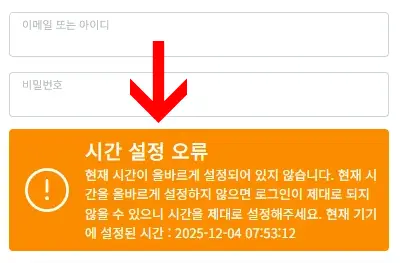 아래와 같이 로그인 페이지에서 '시간 설정 오류' 문구가 확인된다면, 윈도우의 시스템 시간을 확인해 주세요.