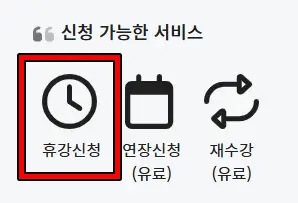 2) 왼쪽에 나오는 [신청 가능한 서비스] 중 [휴강신청 버튼]을 클릭합니다.