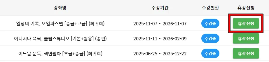 3) 이동되는 페이지에서 원하는 강의의 '휴강신청' 버튼을 다시 한번 클릭해 주세요.