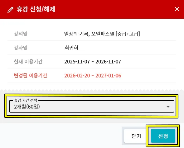 4) [휴강 신청/해제] 설정 팝업이 노출되면 원하는 휴강 기간을 설정하여 휴강 신청 하실 수 있습니다.