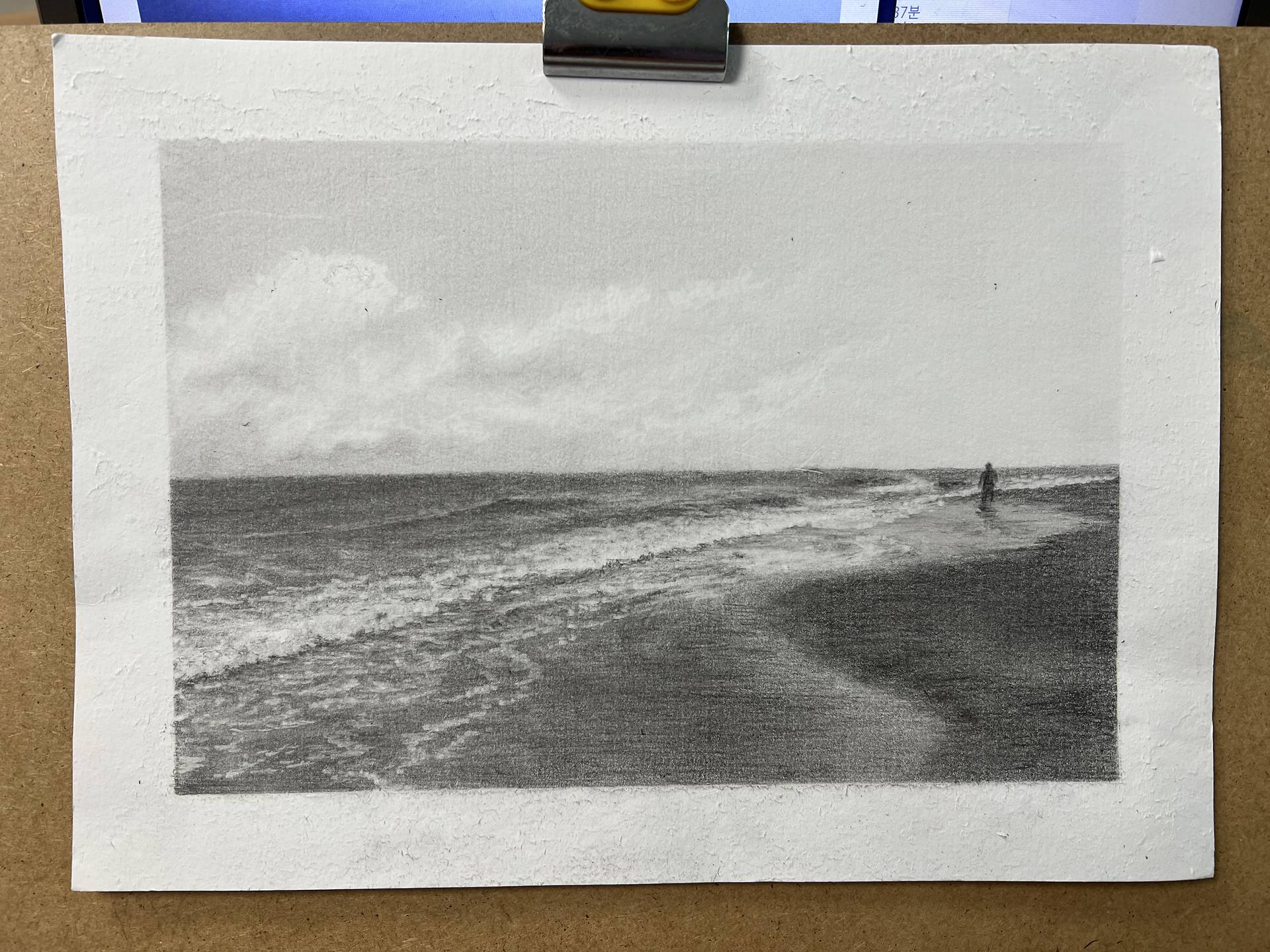 일단 전체적인 톤을 맞추는 게 쉽지 않았어요. 처음에 너무 연하게 깔았는지 하늘에 구름도 안보이고. . . 바다도 하다 보니 색이 점점 더 들어가 너무 어두워진 것 같기도 하고. . .포말은 말할 것도 없구요. ㅠ 생각보다 잘 안 나오네요. 그러다 보니 종이는 점점 지저분 ㅋ, 하물며 마스킹 테이프는 왜 이렇게 뜯어지는지..ㅠㅠ 아주 총체적 난국입니다. 너무 창피해서 올리지 말고 다시 해보려다 선생님 조언이 절실하여 부족하지만 첨삭 요청 드려봅니다.