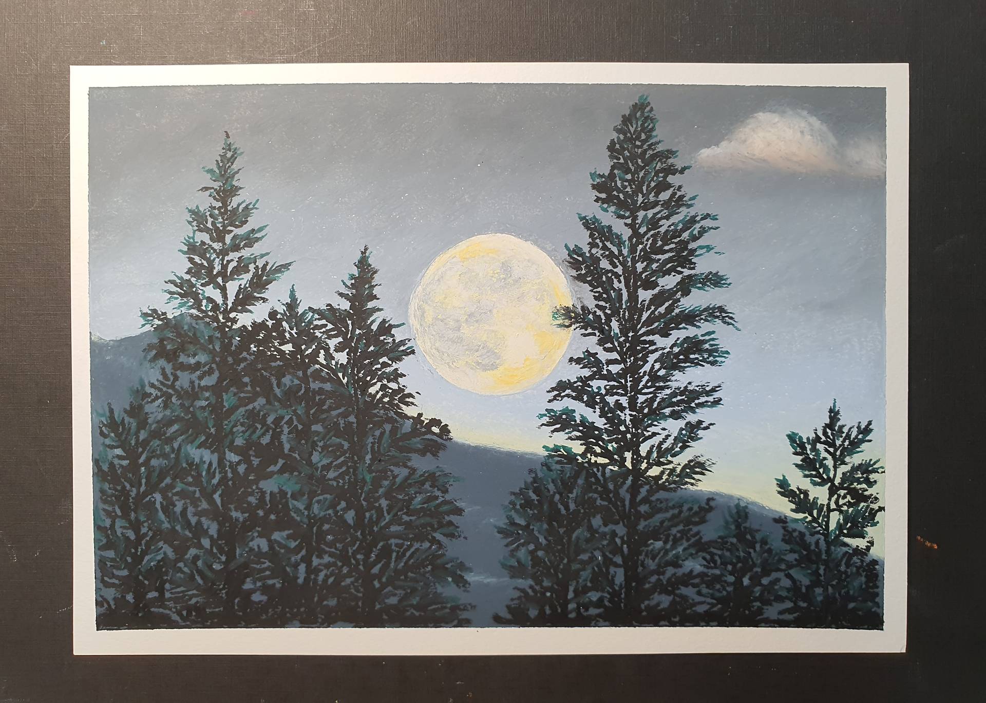 선생님 안녕하세요^^보름달이 뜬 밤하늘 올립니다~밤하늘 보름달 표현과 밤에 보이는 구름 표현도 재미 있었습니다^^구름 한 조각 그리는데 여러가지 색이 들어가는게 신기했습니다^^가족들이 보고 늑대가 나올것같다고 하네요^^즐거운 시간이었습니다^^