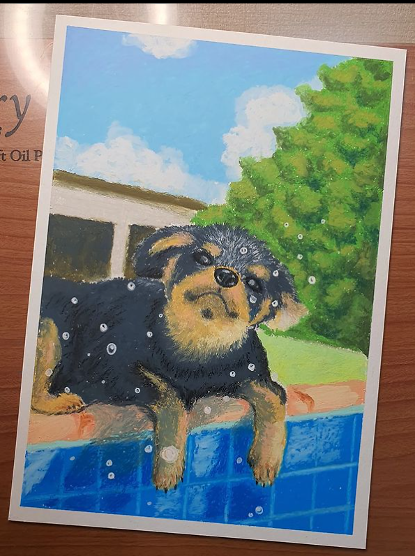 선생님 안녕하세요^^수영장 강아지 그림 올립니다^^눈동자 반짝이는 부분이랑 강아지 발이 너무 부자연스러운데 어떻게 표현해야지요? 어렵습니다^^;;;;;파스텔위에 색연필로 색이 잘 안올려지고 계속 파이기만해서 몸부분은 검정 색연필로 안돼서 파스텔로 올렸습니다.가족들에게 보여주니 강아지가 안귀엽다고 하네요 ㅠ.ㅠ어떻게 해야 귀엽게 보일까요?그래도 그리는 동안 밝은 느낌의 그림이라 즐거웠습니다^^감사합니다~