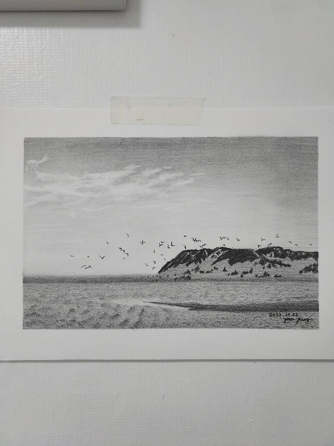 선생님 따라 한 선 한 선 긋다보니 하늘.바다가 완성되었어요.
