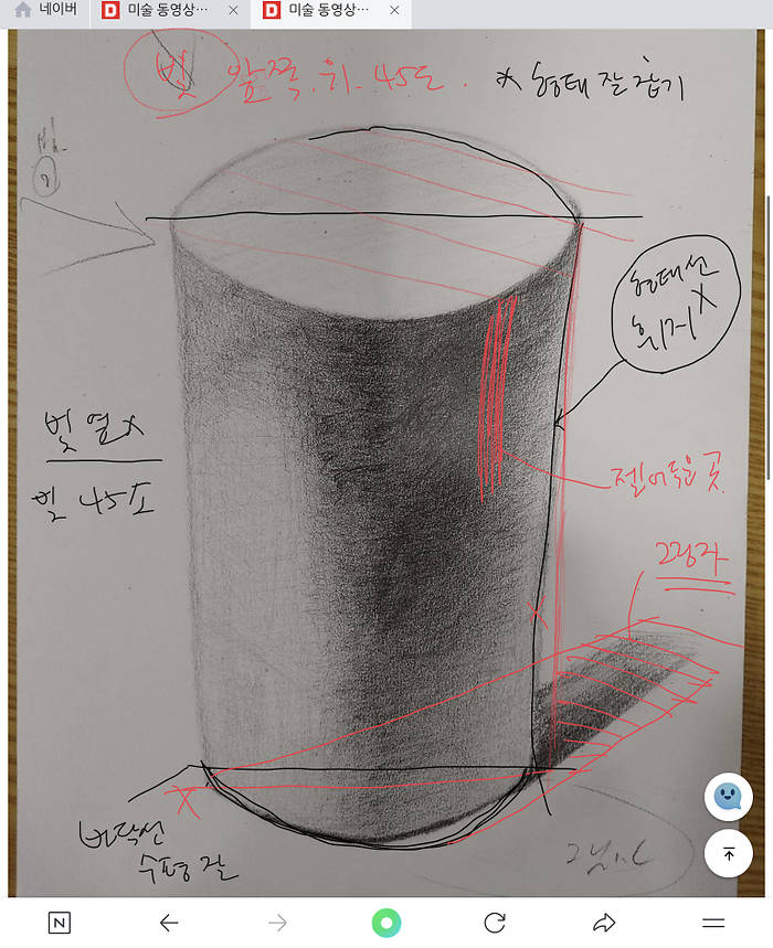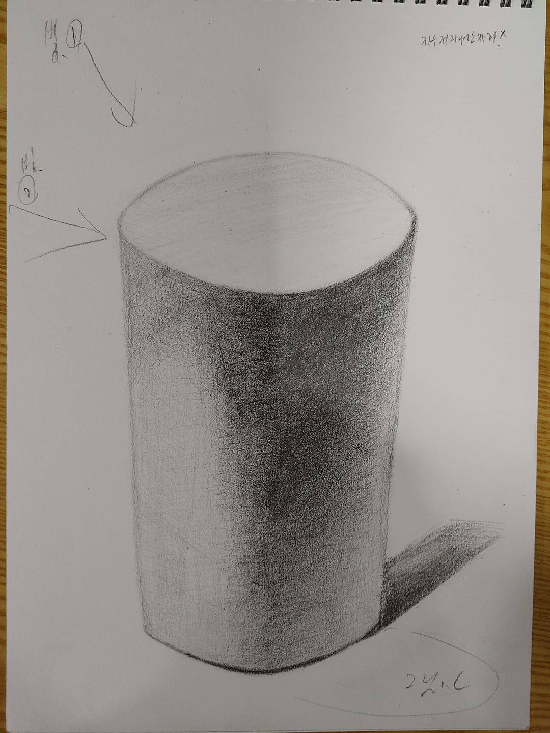 1.원기둥도 정육면체 만큼 어려웠습니다. 2.조심 살살 해도....찍선나오고 3.지우개질 하다 푹 들어가고 거기 마무리도이상해 지고.... 4.뮌가 마무리가 이상한거 같은데...하면서도올립니다. 5\. 기둥 좌상45° 에서 빚받을때 기둥 그림자 방향이 맞는건가요? 감사합니다.