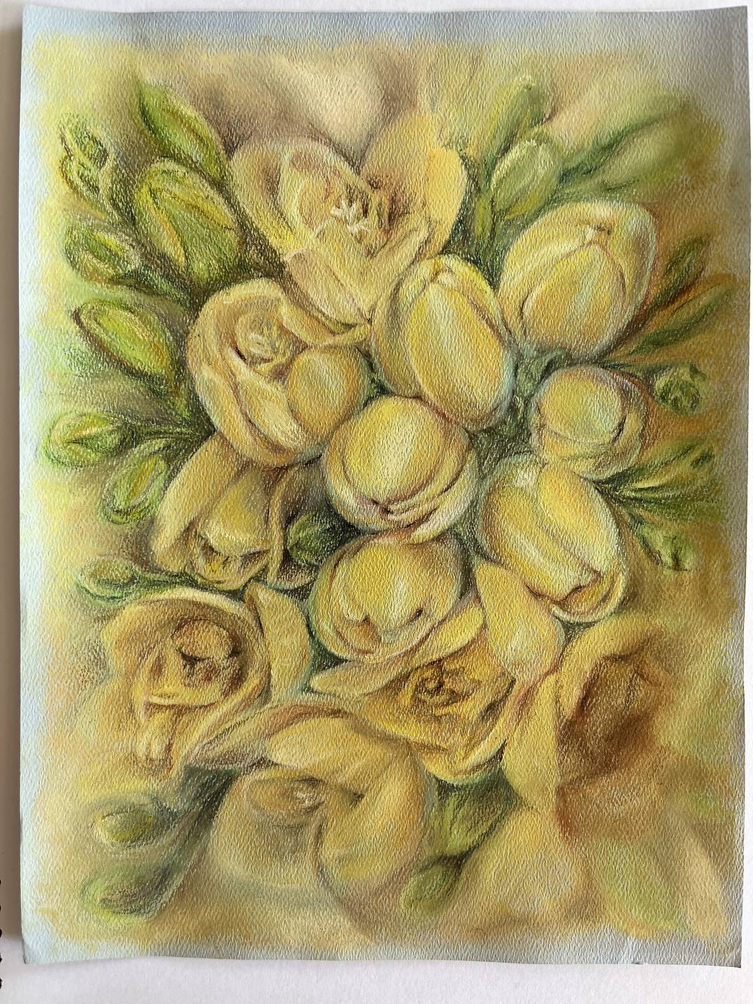 프리지아의 봉우리들이 예뻐서 다른 사진도 참고해서 그렸습니다^^ 물로 칠하기는 망칠까봐,,지문이 닳도록 문지르기만 열심히 했어요^^; 사각파스텔이 없어 구입해놓았던 원형파스텔로 사용했습니다. 사진이 제가 그린 그림의 색감과 조금 다르게 느껴지지만 올려봅니다~~