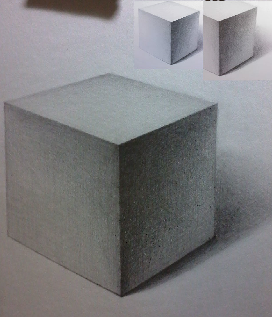 강의 보고 따라 그린 정육면체입니다. 선 연습을 많이 안했더니,, 엄청 오래걸렸습니다ㅠ 선 쓰는거 지적받고 싶은데 폰카라 선 터치 잘 안나왔ㅜ (폰카 찍는 위치에 따라 다르게 나오네요;;막 굴절하고) 수정보완할 부분 부탁드려요(- -)(_ _) 그리고... 궁금한게 많아서 죄송합니다. Q&A에 따로 올리지 않고 그냥 같이 올립니다. 형태선 - 선연습이 부족해서 형태선 거의 지우개로 만드는(선이 하나만 남기고 지우는;;)데 이렇게 하면 안되겠죠?;; 그리고 형태선을 아주 흐린선으로 잡았는데 조금 진하게 잡고 지우면서 그리는 게 나을까요? 명암1. - 어두운 면을 그릴 때 진한선이 조절이 안되서 흐린선으로 여러방향 계속해서 깔았습니다 뭉개지지 않게 선생님 말씀대로 나중에 올리는 선이 두꺼워지지 않도록 신경쓰면서요. 원하는 명암이 나올 때까지 이렇게 선을 계속 깔아도 되나요? 아님 진한선을 잘 조절해서 선을 너무 많이 안쓰는게 좋나요? 명암2. - 어두운면의 반사광은 중간면의 어두운 곳보다 더 어둡게 그려야 한다고 하셨는데요. 그럼 중간면의 밝은 부분은 밝은면의 어두운 부분보다 더 어둡게 그리면 되나요? 강의 들으면서, 교재 아웃풋 같이 보면서,, 집에 있는 책 [김이출(저) /정밀묘사] 도 참고 했는데 이 책에 나오는 정육면체 그림은 반사광과 중간면이 밝게 표현되 있어서요. 명암과 밀도를 어느정도까지 표현해야 하는지요. 연습시간에 제약이 있을때, 같은시간 안에 한 두장을 공을 들여서 완성도를 높여 그리는 것과, 그림을 여러장 반복해서 그려보는 것 중, 어떤 것이 효과적인 연습방법일까요?