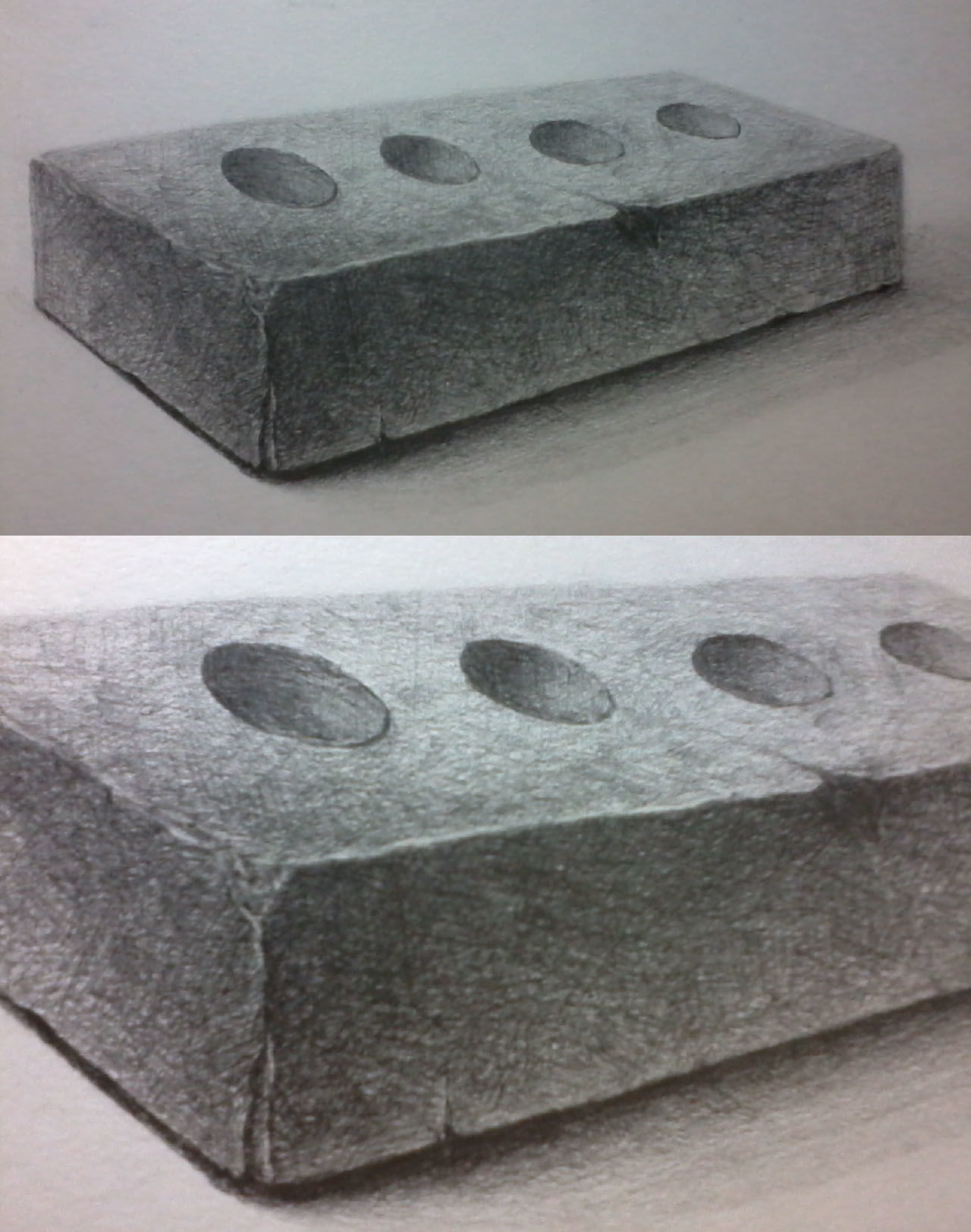 정육면체 성의 있는 답변 주셔서 감사드려요. 오늘은 벽돌을 그려봤는데 짧은선 쓰는게 긴선보다 더 어렵네요ㅜ 짧은선으로 어떻게 채워야 맞는 건지 잘 모르겠어서 중구난방으로 그렸더니 좀 지저분해보이는 것도 같고,,, 형태선 너무 흐리게 잡았는지, 칠하다 없어져서 모양이랑 구멍이 좀;; 저는 그림이 왜케 까매지는 걸까요? ㅜㅜ 수정하려고 하면 할 수록 질감 표현하는 거랑은 멀어지는 거 같고,, 선생님은 슥슥 그리고 많이 안 그리셔도 강조될 부분과 사물의 특징이 확실히 표현되는데 똑같이 따라해볼려고 해도 덧칠 무쟈게 하고 있어요... 어떤 부분을 바로 잡아야 할지, 신랄한 지적 부탁드립니다.