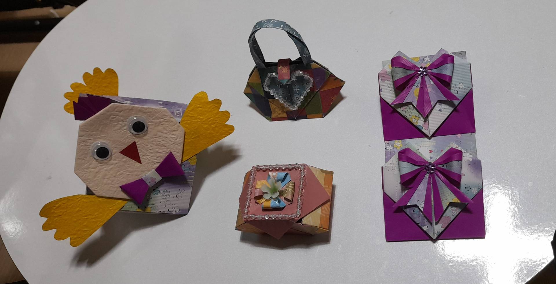 병아리바구니만 원 사이즈대로 만들었고, 장미보석함과 토드백, 하트다용도꽂이는 미니어처들입니다 사실 처음부터 미니를 만들려고 한 게 아니라 낱장으로 여러 디자인의 양면 포장지를 구하기가 힘들어 있는 거로 다 만들어 보자 해서 시작했는데 의외로 큰 기쁨을 주네요~